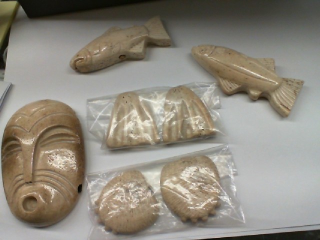 Discover authentic Alaskan artwork with these intricate bone/ivory carvings. Depicting varied scenes of fish, bearpaw, fins, or spirit carvings, each piece represents rich Alaskan culture. Hand-carved with extreme detail, these pieces serve as both beautiful decor and historic keepsakes. Prices range from $39.99 to $79.99.
