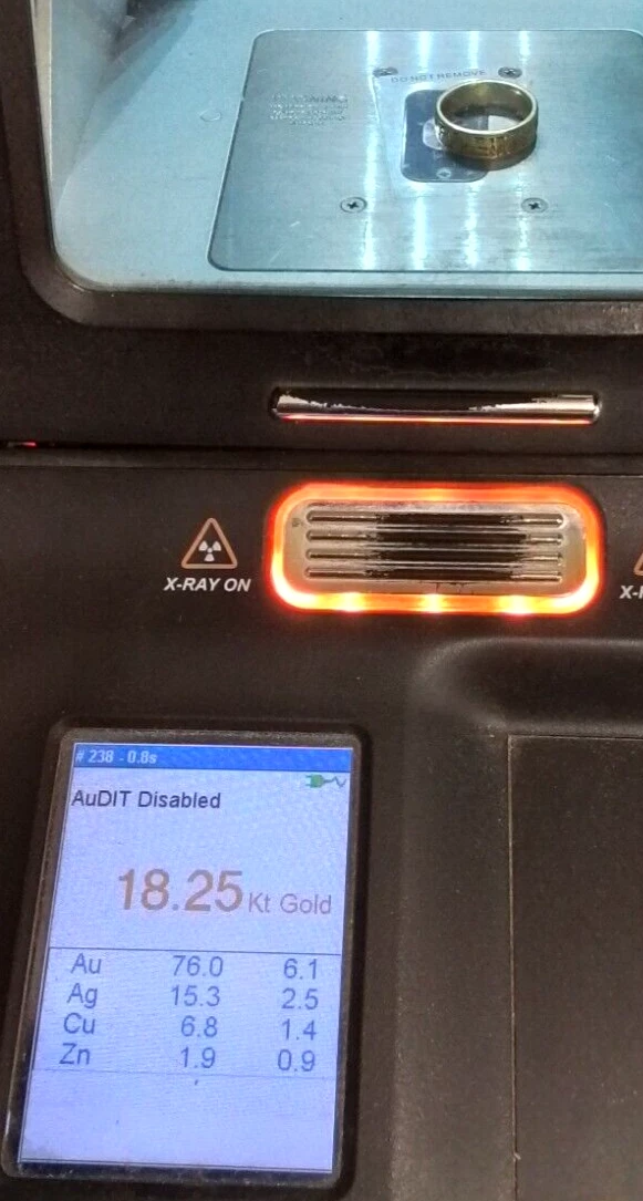Band is 18k but the nugget inlay seems to be in a range of 18k-20K