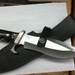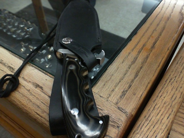 The Hibben Knives GH1168 is the Gil Hibben Alaskan Survival Knife, a fixed-blade knife designed by Gil Hibben for hunting and survival. It features a 6 7/8-inch spear-point blade made of 420J2 stainless steel, a full tang, and black Micarta handles. The knife comes with a leather sheath and is endorsed by the Alaska Professional Hunters Association.
