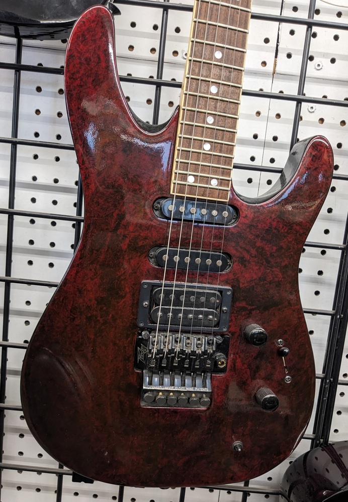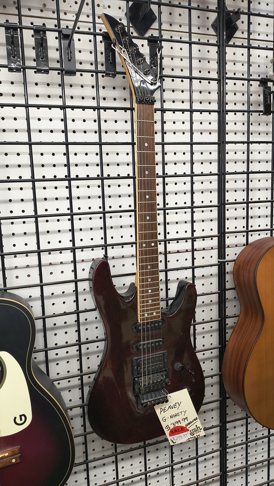 The Peavey G Ninety guitar is a premium musical instrument featuring a solid body design known for its exceptional tonal quality and versatility. Its easy playability, rich tone, and remarkable durability, make it a desirable piece for both hobbyists and professionals. Comes with a hardcase for protection and portability.