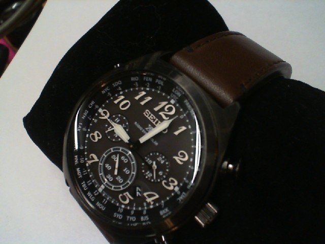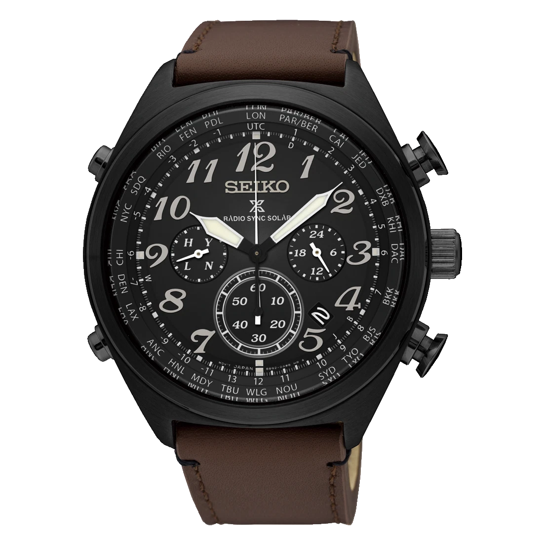 Black ion-plated stainless steel case with a brown leather strap. Fixed black ion-plated stainless steel bezel. Black dial with luminous black hands and Arabic numeral hour markers. Minute markers. Utc markers. World time cities around the outer rim. Dial Type: Analog. Luminescent hands and markers. Date display between the 4 and 5 o'clock positions. Chronograph - three sub-dials displaying: 60 second, 60 minute and 24 hour. Seiko caliber 8B92 eco-drive movement. Scratch resistant Hardlex crystal. Screw down crown. Solid case back. Round case shape. Case size: 44.5 mm. Case thickness: 12.9 mm. Band width: 24 mm. Tang clasp. Water resistant at 100 meters / 330 feet. Functions: chronograph, date, hour, minute, second, world time (25 time zones), power save function. Additional Info: radio-controlled: receives radio signals to precisely adjust the time and calendar. Prospex Series. Sport watch style. Watch label: Japan Movt. Seiko Prospex World Time Chronograph Black Dial Men's Watch SSG015.