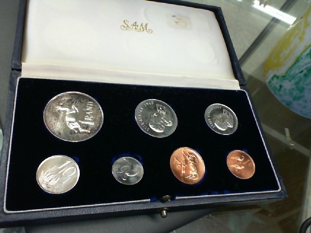 This South Africa 1965 7-coin set features an aged patina on the larger denomination. The set is a reflection of historical South African currency, offering numismatic value aside from the intrinsic metal content. An ideal asset for collectors seeking distinctive, vintage South African money.