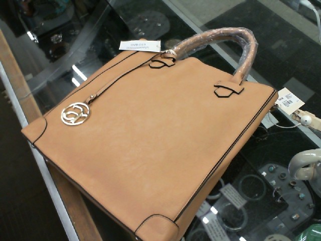 This tan leatherette purse or tote showcases a sleek, modern design. Manufactured from durable faux-leather, it boasts ample storage space with multiple compartments. Ideal for work or casual use, this handbag reverses to a different color for versatility. Its sturdy straps allow comfortable shoulder carry. New and never used. A stylish accessory to complement any outfit.