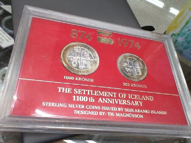This is a unique collector's set featuring 874 - 1100 - 1974 Sedlabanki Islands Kronur 1000 (30gr) and 500 (20gr) sterling silver coins. These pieces commemorate the 1100th anniversary of the settlement of Iceland. Both coins are crafted from premium silver and are choice items for numismatic enthusiasts.