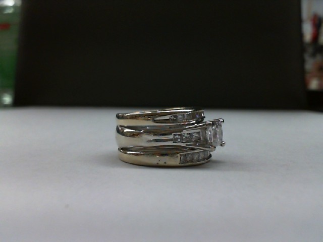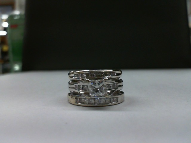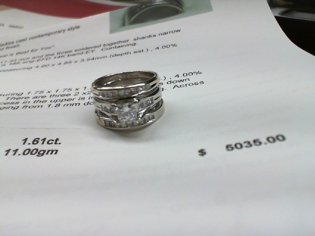 This 18K &14K white gold wedding set, weighing 11 grams, boasts 1.61ct of Total Weight Carat diamonds. The standout centerpiece is a 3/4 ct princess cut diamond, graded G-I-1. Comes in size 6.25. The set appraises at $5035, with purchase paperwork included.
