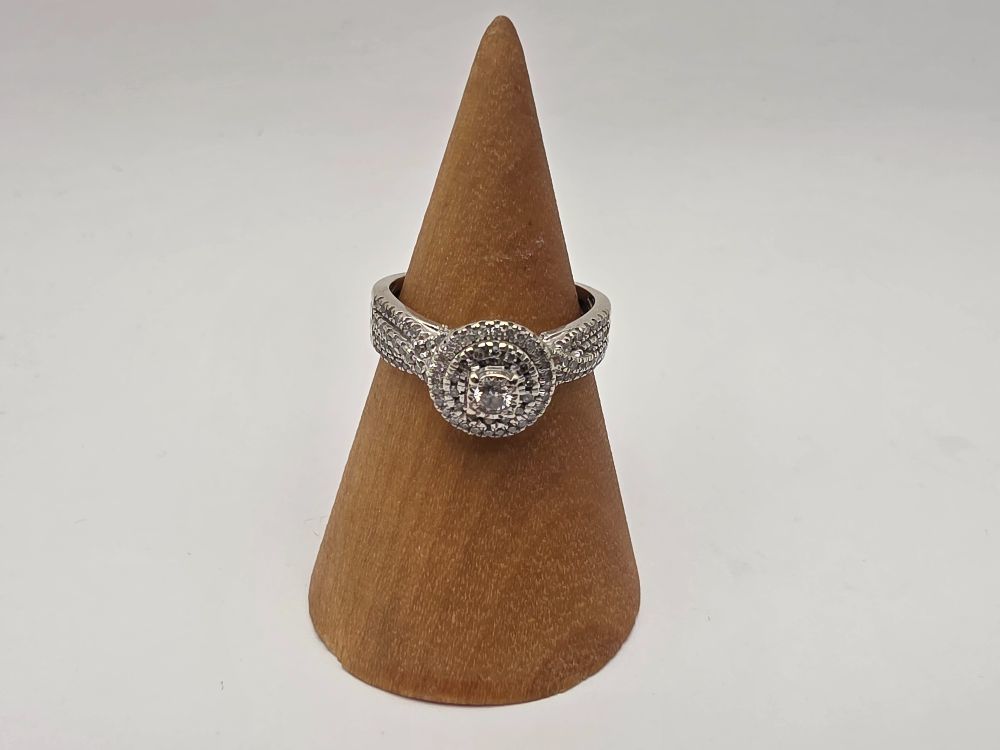 10K WHITE GOLD RING WITH .07 ROUND CENTER DIAMOND AND DIAMOND CHIPS AROUND SIZE 8