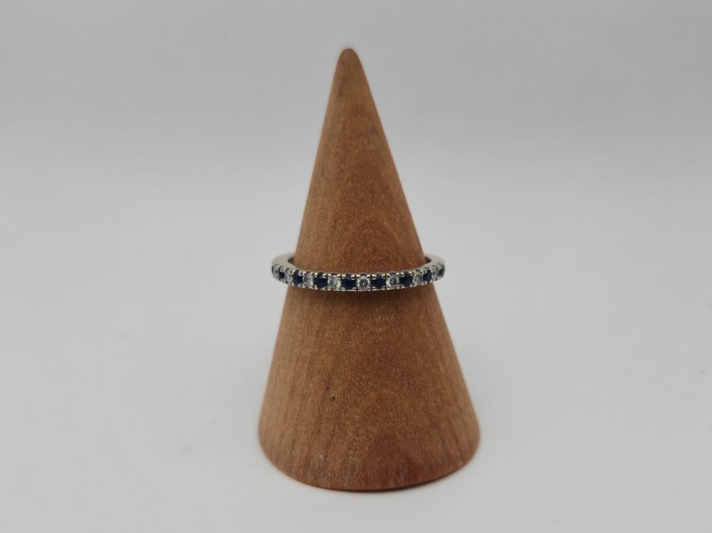 10K WHITE GOLD RING WITH SMALL ROUND DIAMONDS AND BLUE STONES SIZE 8 1/2