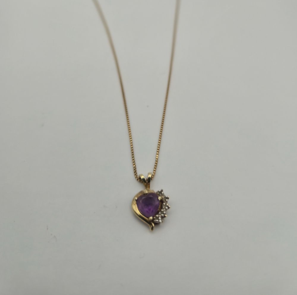 10K YELLOW GOLD BOX NECKLACE WITH HEART PENDANT PURPLE STONE AND DIAMOND CHIPS RUNNING UP SIDE 18"