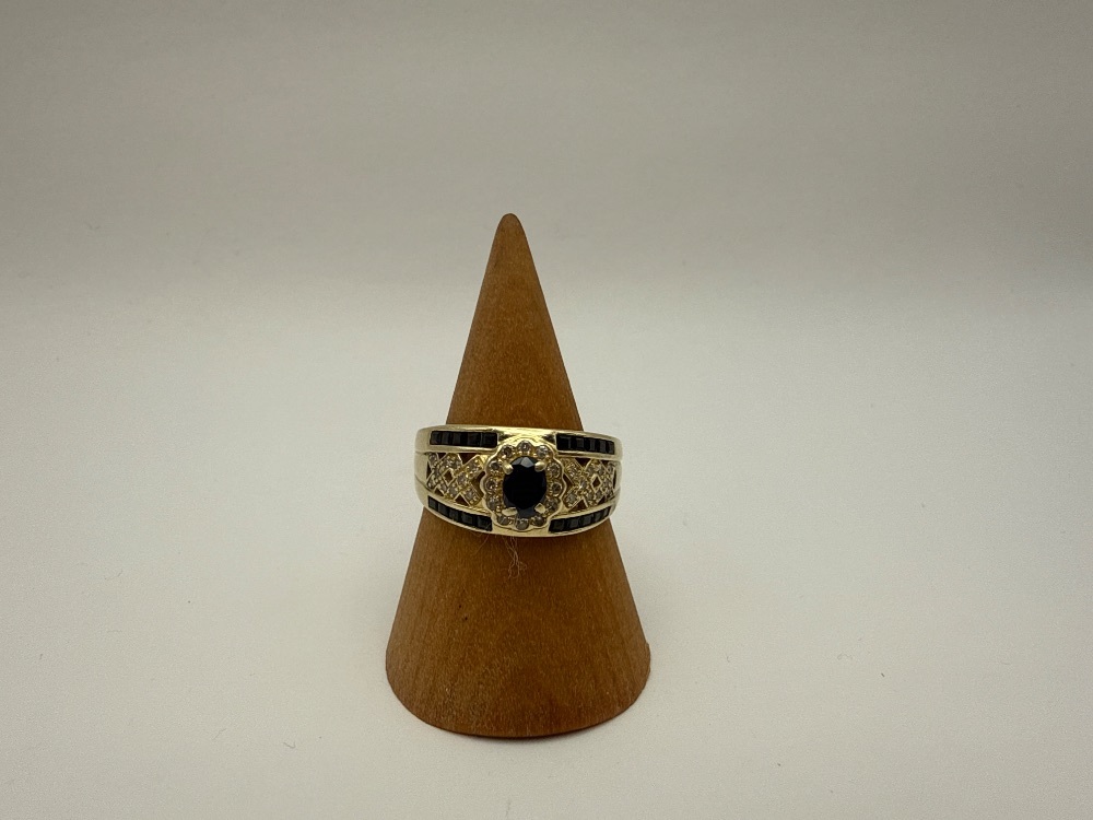 14K 7.1 GRAMS GOLD RING WITH BLACK DIAMONDS AND SMALL DIAMONDS ON EACH SIDE AND AROUND CANTER BLACK DIAMOND size 10