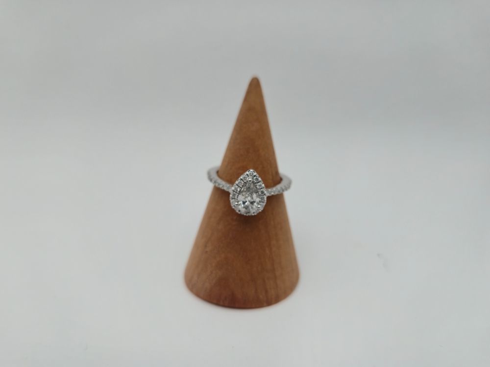 14K WHITE GOLD RING WITH .40 CENTER PEAR DIAMOND AND DIAMOND CHIPS SURROUNDING SIZE 6
