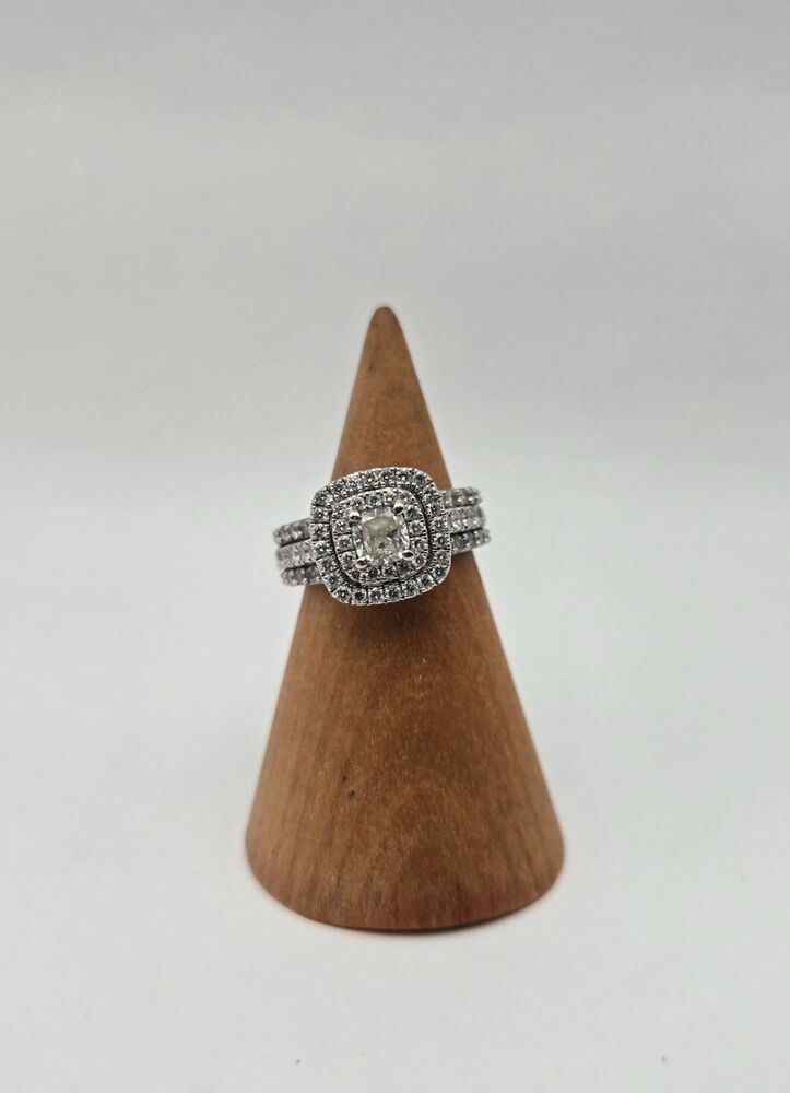14K WHITE GOLD RING WITH .40 PRINCESS CENTER DIAMOND SURROUNDED BY SMALL DIAMONDS SIZE 5