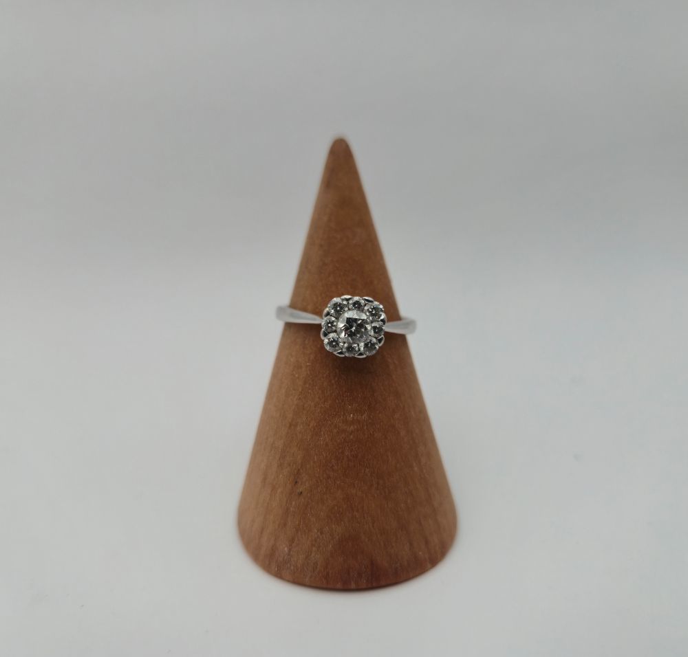 14K WHITE GOLD RING WITH .15 CENTER DIAMOND WITH HALO OF DIAMONDS AROUND SIZE 5