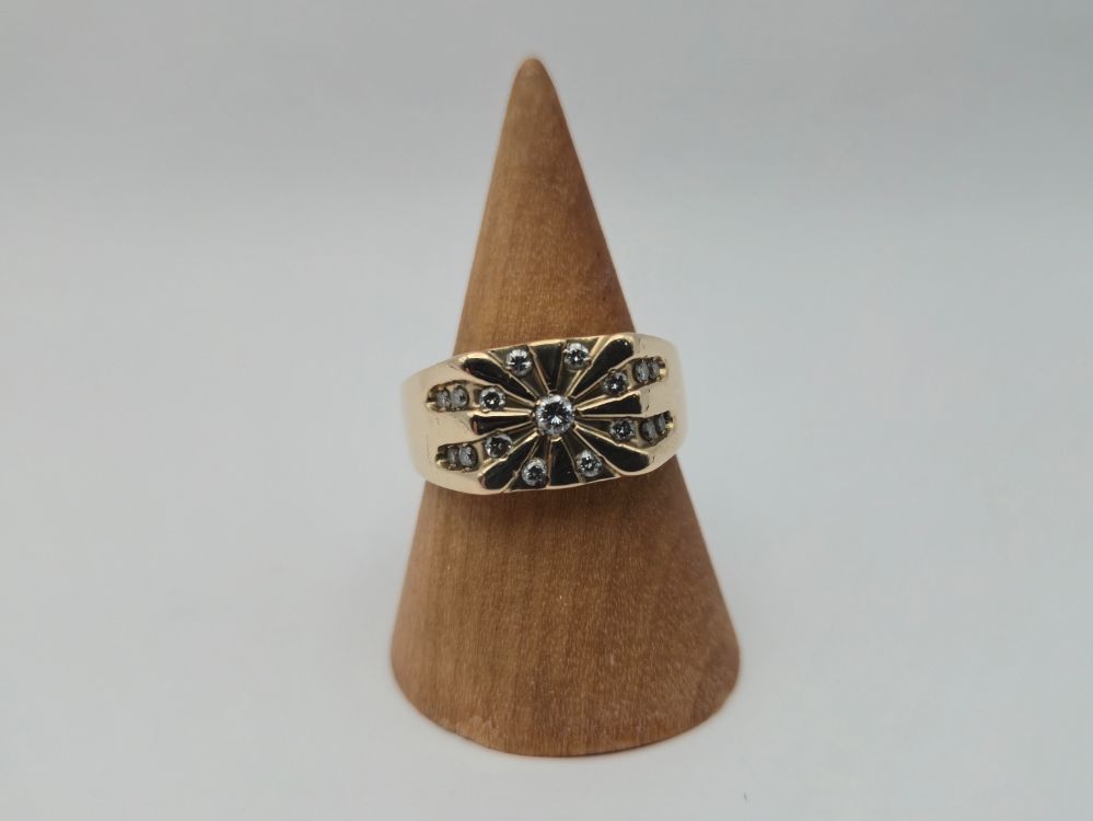 14K YELLOW GOLD RING WITH .07 ROUND DIAMOND AND .03 ROUND DIAMONDS AROUND SIZE 10 1/2