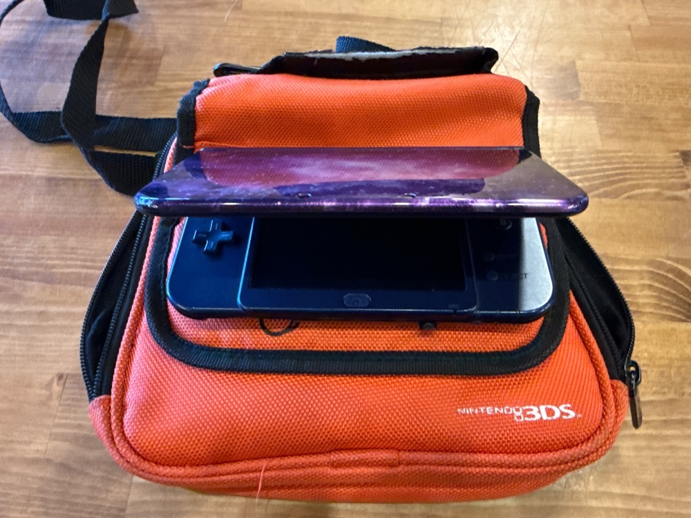 NINTENDO 3DS XL GALAXY WITH CHARGER WITH SLIGHT DISCOLORATION BOTTOM LEFT OF TOP SCREEN DOESN'T AFFECT FUNCTIONALITY WITH MARIO CARRYING CASE