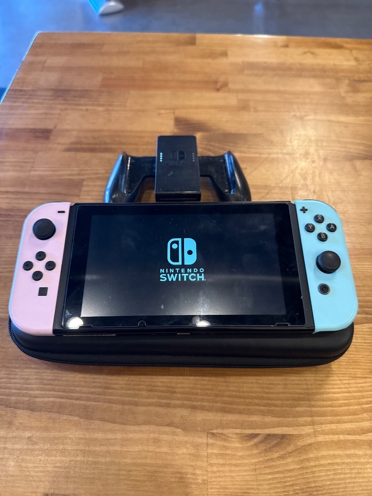NINTENDO SWITCH CONSOLE WITH CONTROLLER GRIP HANDLE AND CASE NO CHARGER, NO OTHE