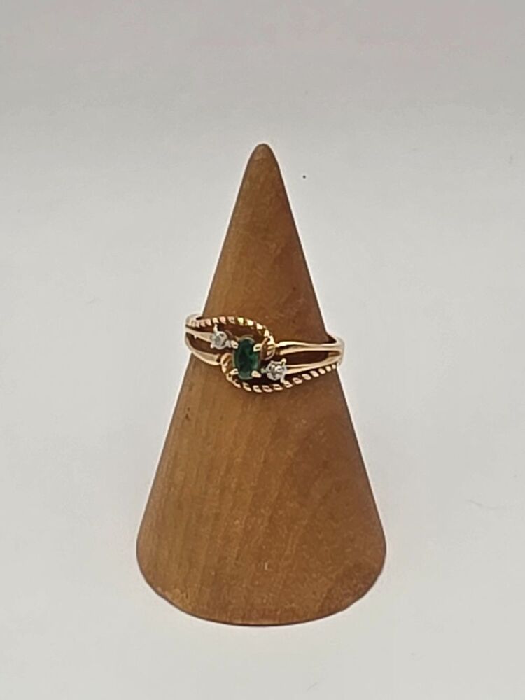 10K GOLD RING WITH A GREEN STONE ON TOP WITH TWO CLEAR STONES ON THE SIDE SIZE 6