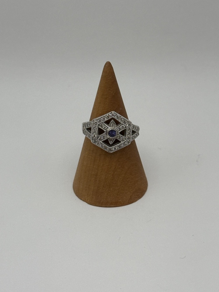 SIZE 8 WHITE Gold 14kt 6.70gms WITH A BLUE/ PURPLE STONE IN MIDLLE WITH SMALL CHIPS SURRONDING IT