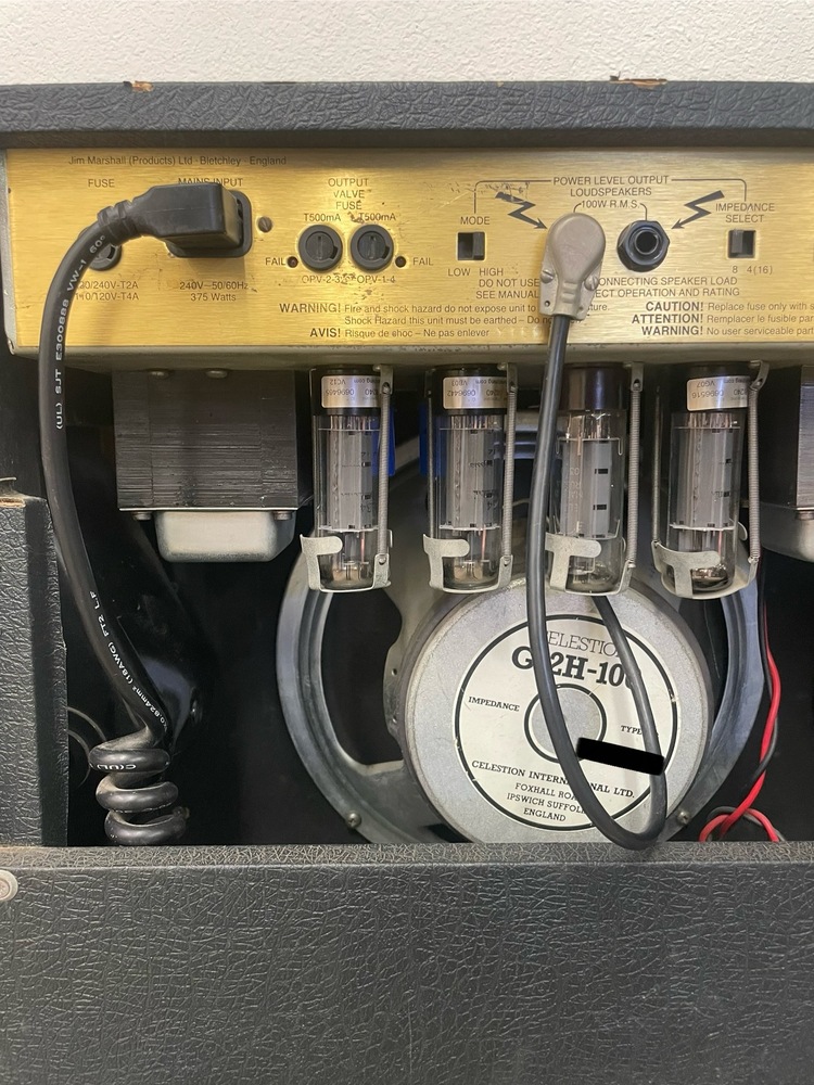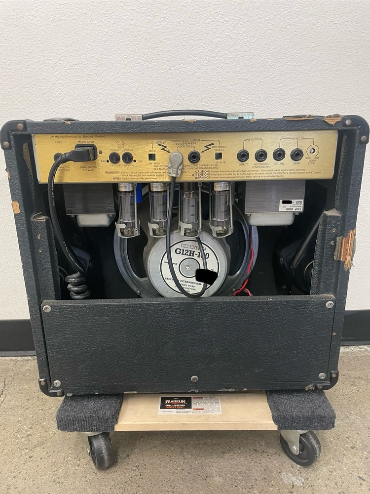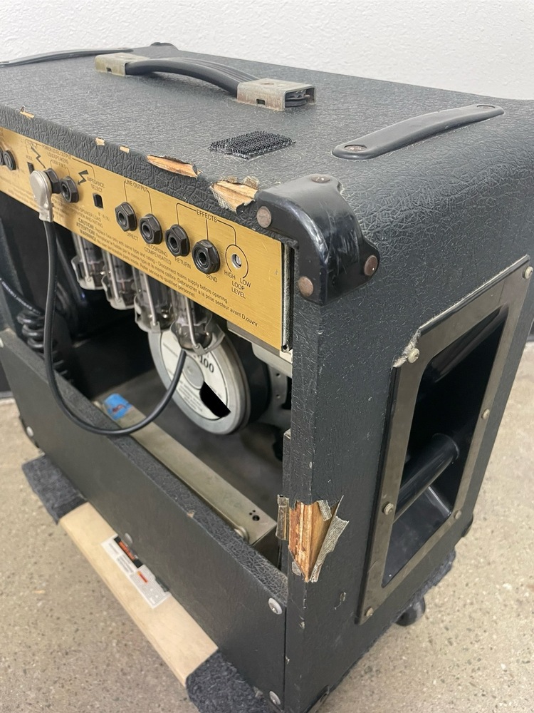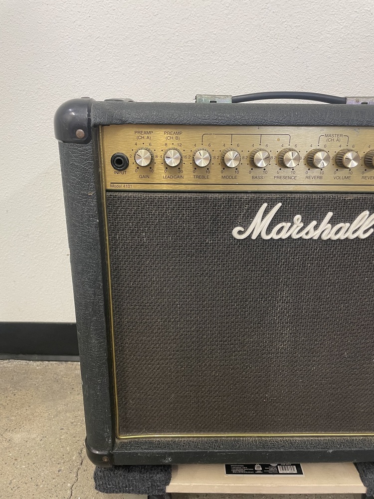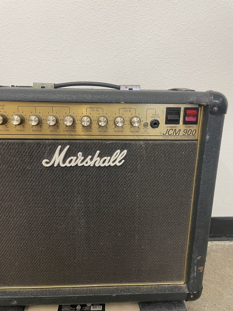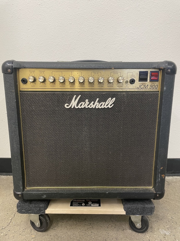 Marshall JCM 900 Model 4101 100-Watt Hi Gain Dual Reverb 1x12 Combo amplifier. Used in moderate condition with several signs of wear from heavy use, including multiple scuffs, fading, and some separation on the exterior covering (see photos). Tested and working, comes with power cord.