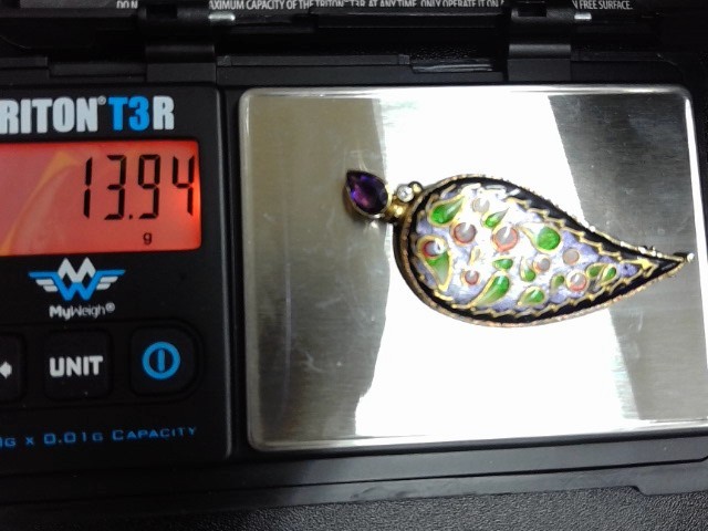 Vintage Enamel 18k gold brooch, done in paisley motif with natural amethyst and diamonds.