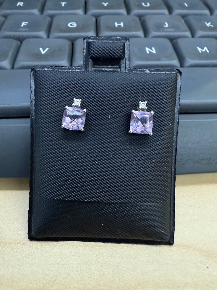 Experience timeless elegance with these 10kt Gold Earrings, weighing 0.92g. Adorned with Emerald cut Amethysts, enhanced by sparkling diamond accents. A beautiful addition to any jewelry collection.