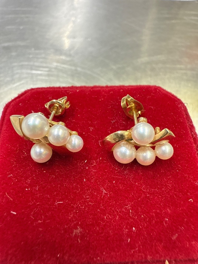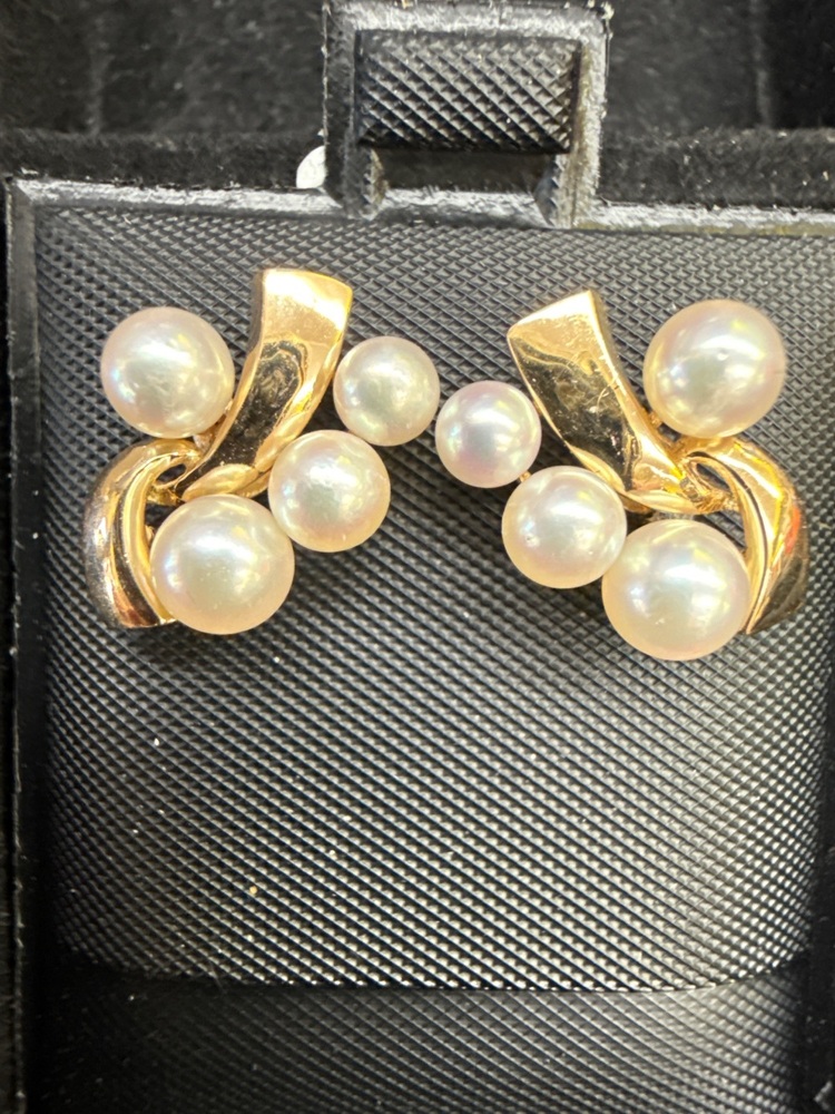 14K Birks, Gold and pearl earrings with diamond accents. Stylish and a wonderful gift for pearl enthusiasts. Screw back backings secure these beautiful earrings.