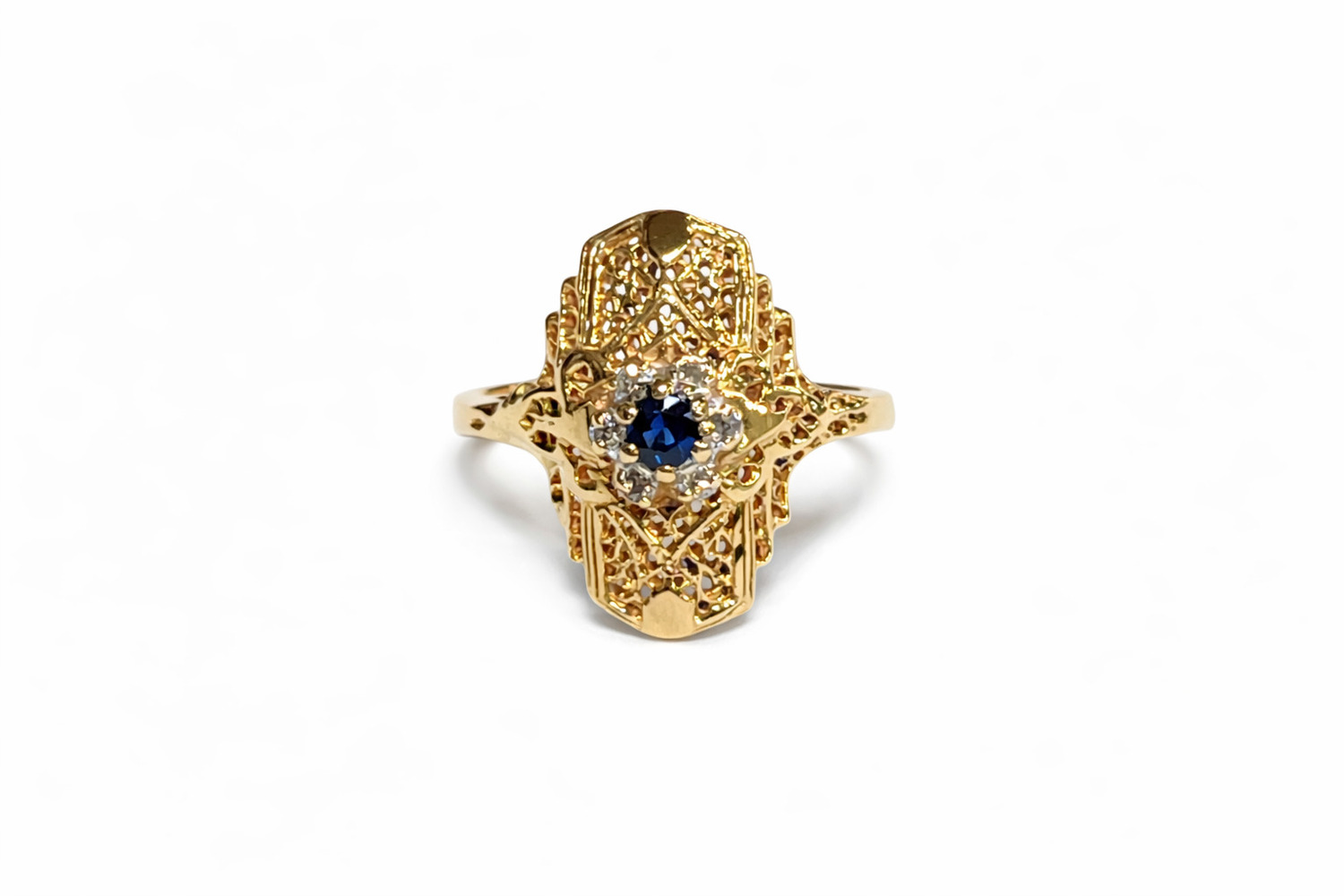 10K Yellow Gold Art Deco Filigree Diamond & Sapphire Ring