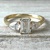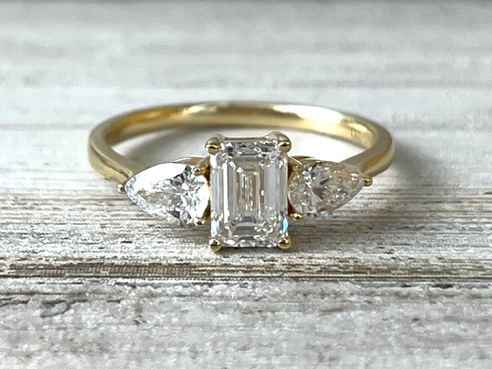 Experience the epitome of elegance with a 1.50 carat total weight, lab-grown diamond engagement ring. The center stone, an emerald cut diamond, is flanked by precious pears on either side. All set in 14k yellow gold, this ring is an exquisite embodiment of beauty and refinement.