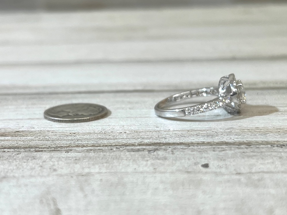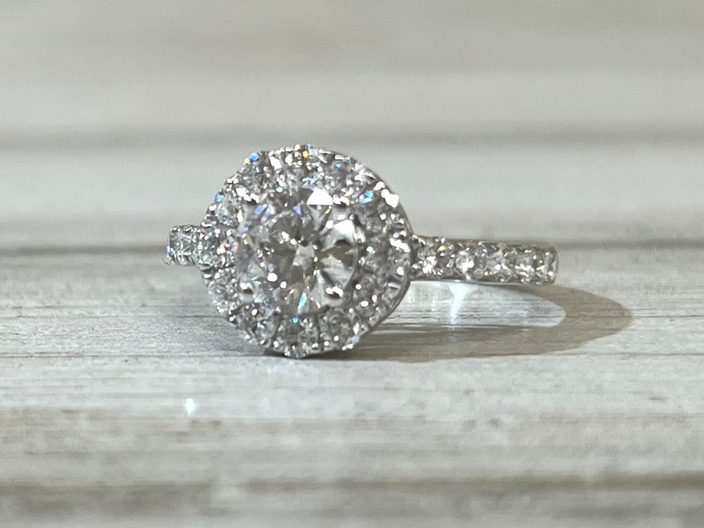 Experience the exquisite elegance of a 2 Carat Lab-created Diamond Engagement Ring. This radiant beauty, adorned with a round halo of French-set diamonds, is set in 14 karat White Gold. A perfect symbol of love and commitment, designed to leave a lasting impression.