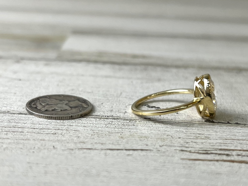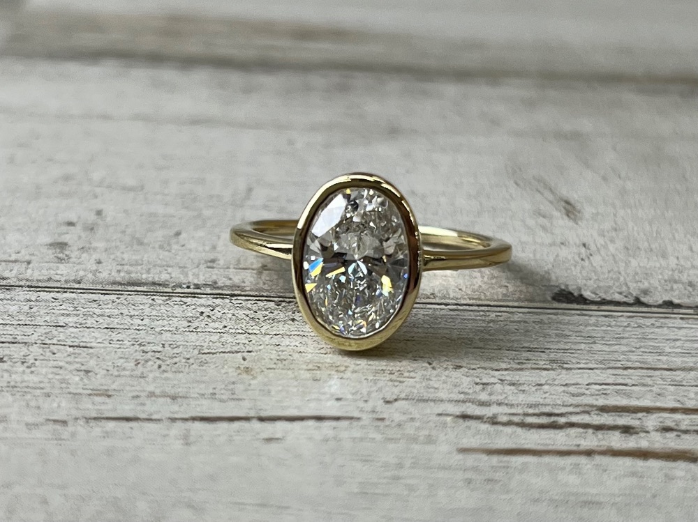 Experience an effortless elegance with this exquisite 2CT Oval Lab-Grown Diamond, artistically framed in a bezel setting. Crafted from 14K Yellow Gold and graded 7 by EGL, this unique piece is the epitome of sustainable luxury.