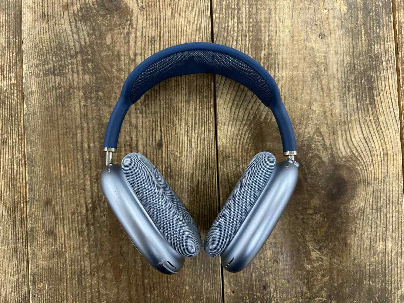 Apple Airpods Max in Sky Blue, comes with a charger.