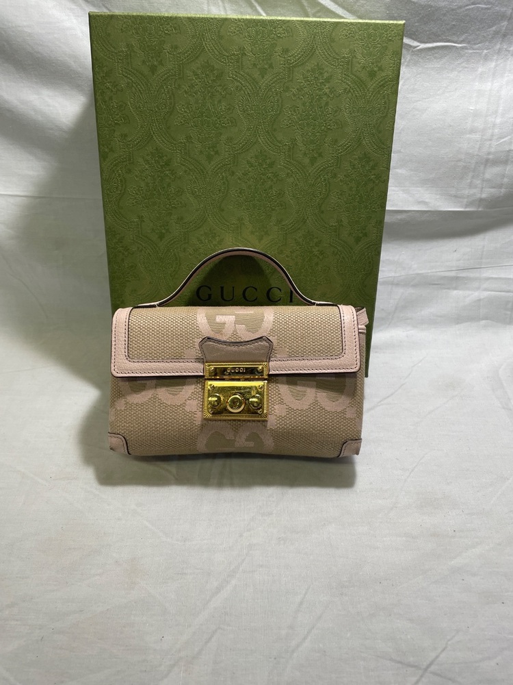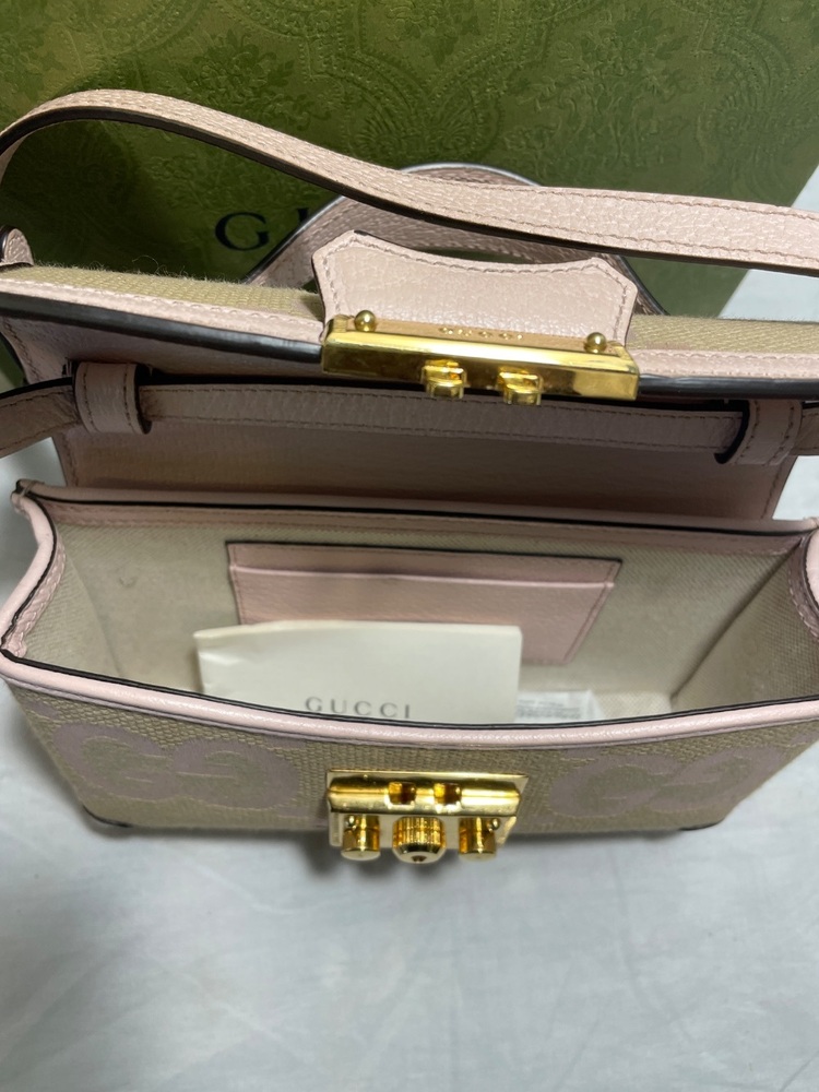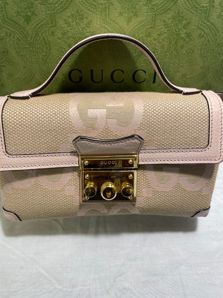 Padlock Jumbo GG mini bag from Gucci featuring light pink, beige, leather, Jumbo GG canvas, padlock fastening, gold-tone hardware, single top handle, adjustable shoulder strap, foldover top, main compartment and internal card slots. It fits an iPhone Pro Max with plenty of room to spare for your daily necessities. Wear it over the shoulder, across the body, or remove the strap and carry it as a top handle clutch. In great condition with dust bag and box.