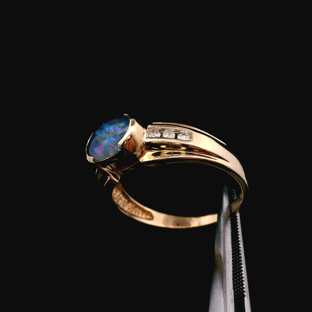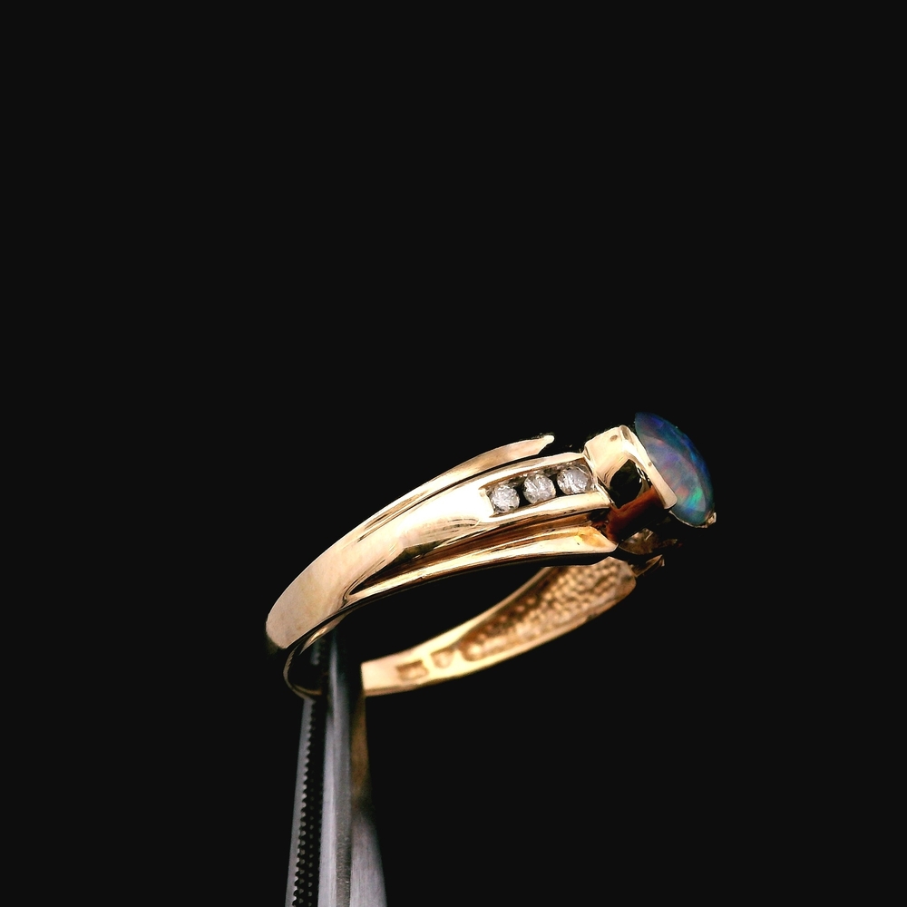 This lovely ring is crafted in 10K yellow gold and features a colorful Synthetic Opal center stone accented by approximately 0.06 ct (6 points) total weight of sparkling accent stones. It is a size 7 and has a total weight of 1.80 dwt (approximately 2.8 grams). The item is in good condition. Please review all photos closely to assess cosmetic condition and the natural characteristics of the stones as the item shown is the exact one you will receive. Please note: Price may vary depending on the price of gold and silver.