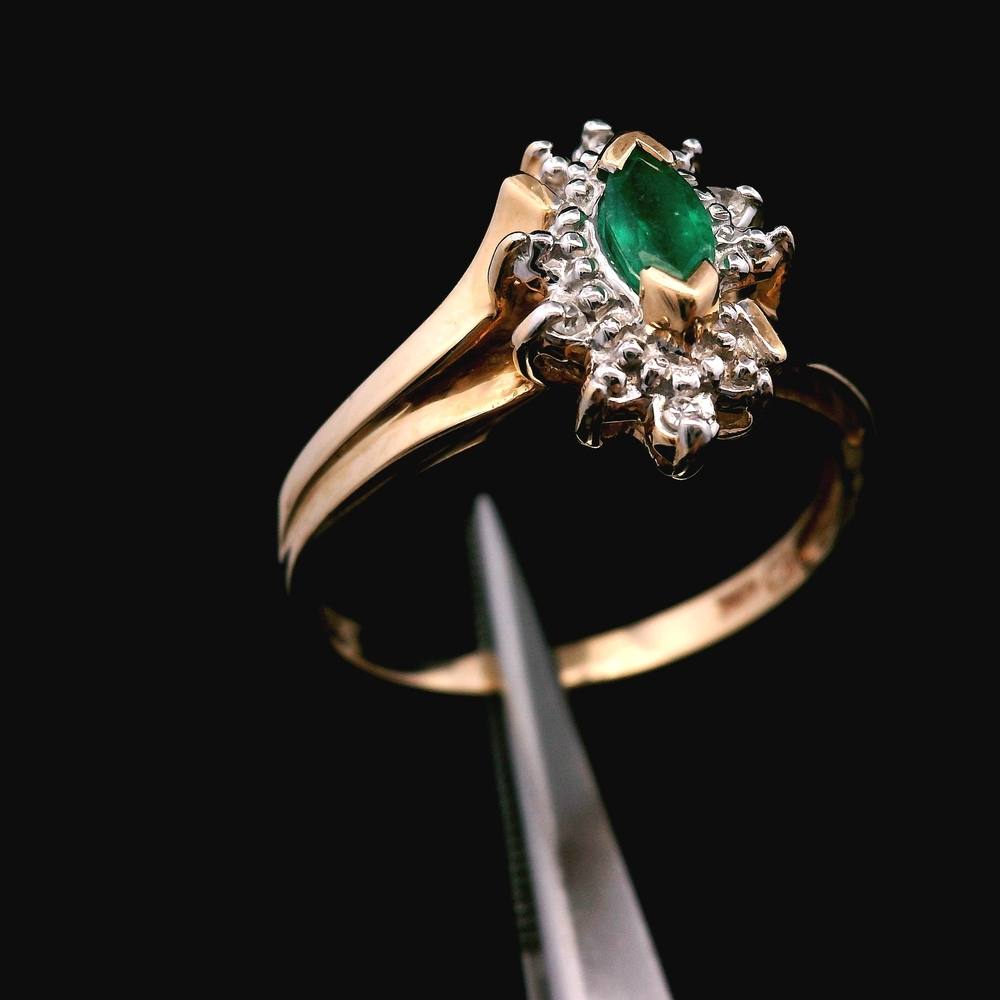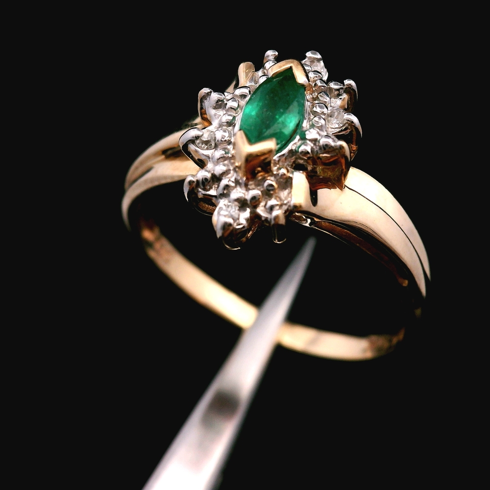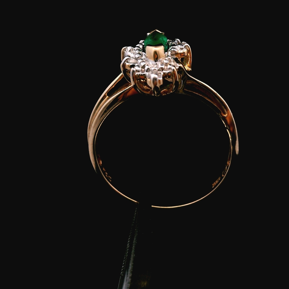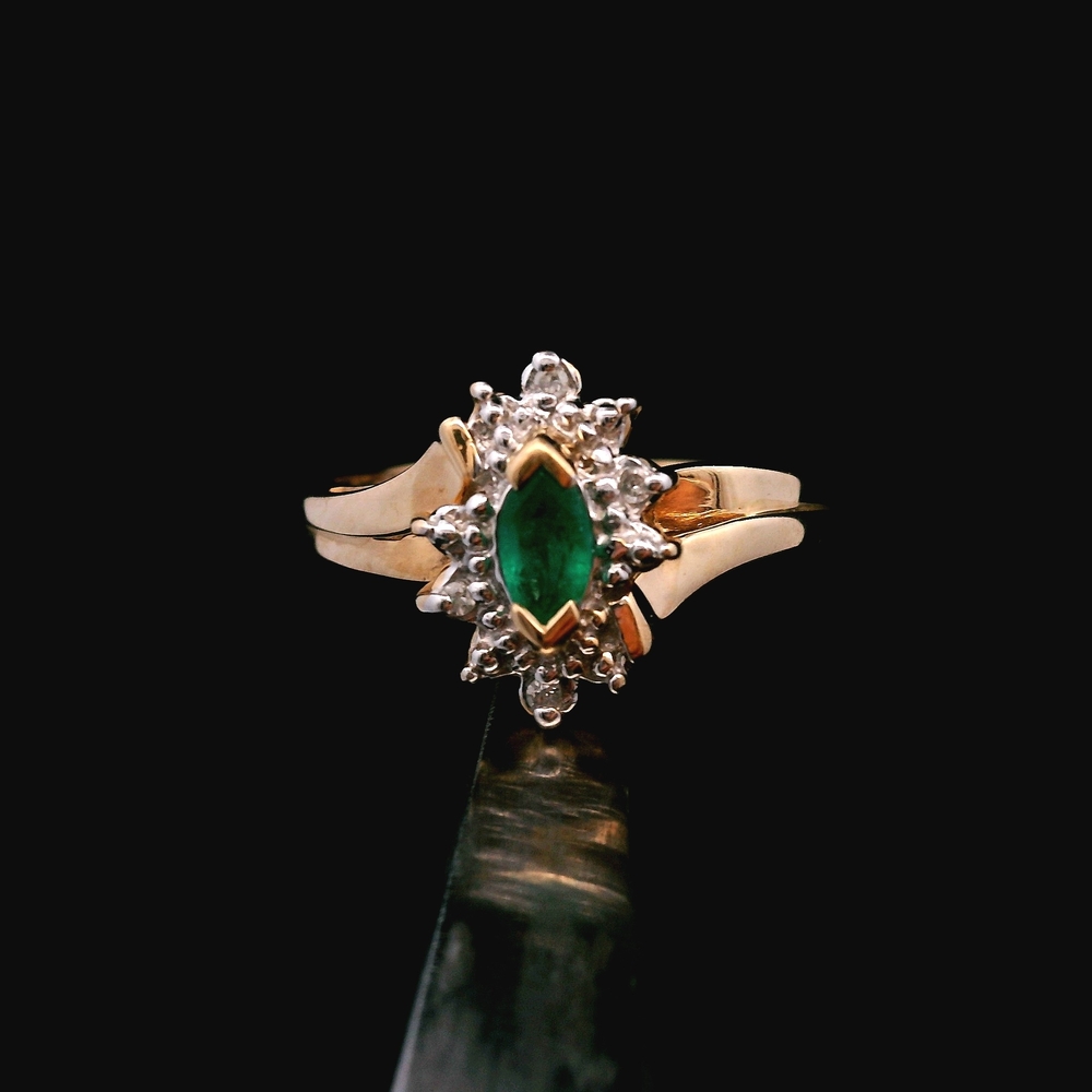 Este anillo de oro amarillo de 10KT presenta una hermosa esmeralda acentuada con pequeños diamantes, en buena condición con ligeras señales de uso normal. El verde intenso de la esmeralda contrasta muy bien con el cálido oro amarillo, mientras que los diamantes añaden un brillo sutil. Con un peso de 1.5dwt, es ligero y cómodo para uso diario. La talla 8 lo convierte en una pieza versátil para cualquier colección.