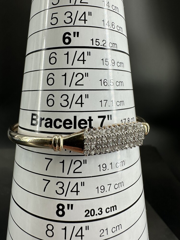 This 10KT yellow gold bangle bracelet features approximately ½ carat total weight of diamonds, adding sparkle and elegance to its classic design. The bracelet measures 7 inches and has a total weight of 5.3 DWT (8.24 grams). A beautiful piece that can be worn daily or for special occasions. Includes a generic jewelry box.