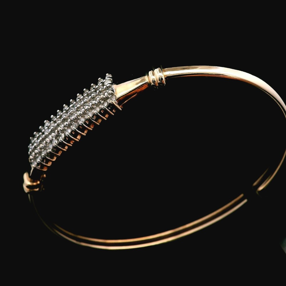 Esta pulsera rígida en oro amarillo de 10KT presenta aproximadamente ½ quilate en diamantes, ofreciendo brillo y elegancia en un diseño clásico. La pulsera mide 7 pulgadas y tiene un peso total de 5.3 DWT (8.24 gramos). Una pieza hermosa ideal para uso diario o para ocasiones especiales. Incluye caja genérica de joyería.