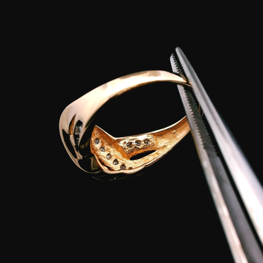 This 10KT yellow gold ring features approximately .12 carat total weight in diamonds, adding a subtle touch of sparkle to a classic band style. Ideal for everyday wear or stacking. Ring size is 7, with a total weight of 2.30 DWT (3.58 grams). Includes a generic ring box.