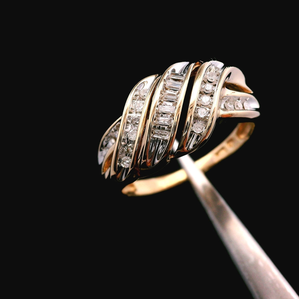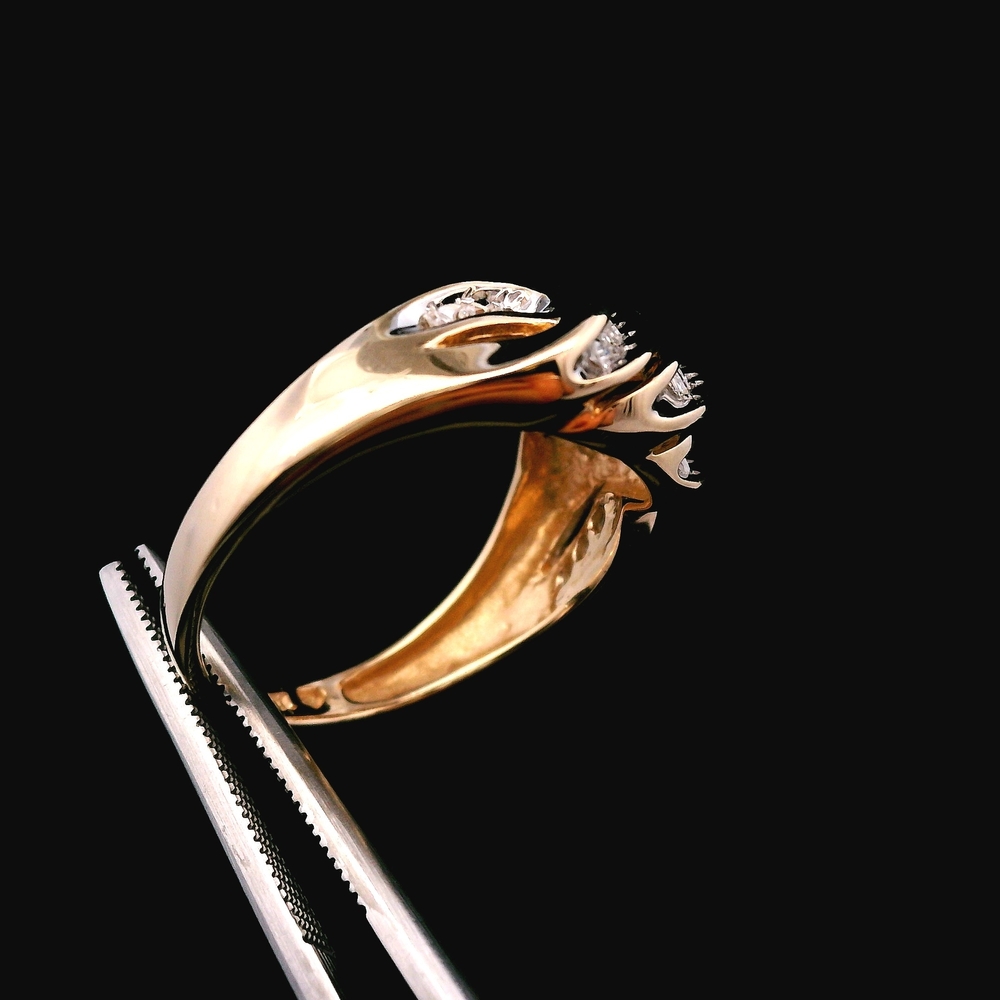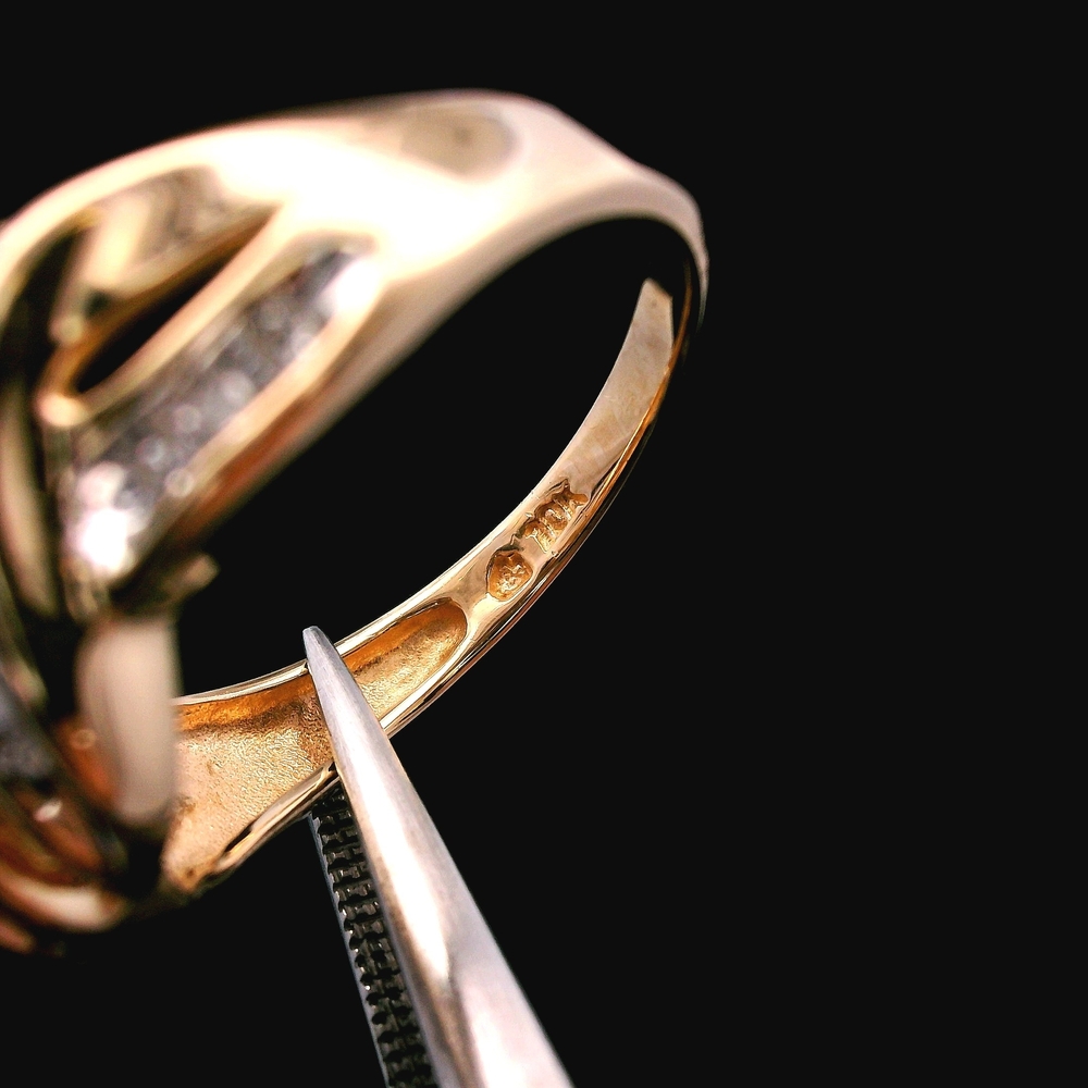 Este anillo de oro amarillo de 10KT presenta aproximadamente .12 quilate en diamantes, ofreciendo un brillo sutil en un estilo de banda clásico. Ideal para uso diario o para combinar con otros anillos. Talla 7, con un peso total de 2.30 DWT (3.58 gramos). Incluye caja genérica para anillo.
