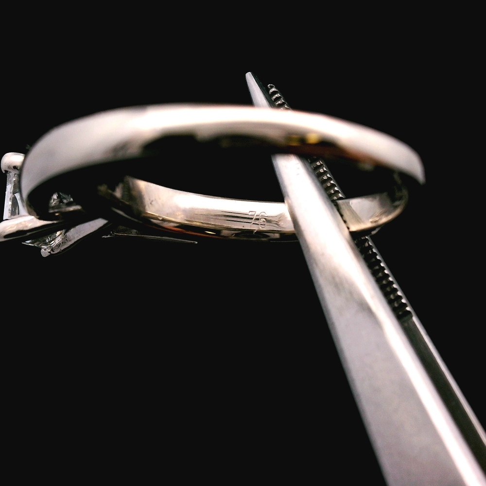 Este elegante anillo solitario está elaborado en oro blanco de 14K y presenta un impresionante diamante de corte princesa certificado por IGI. La piedra central pesa 0.75 quilates con claridad I1 y color I-J. El anillo es talla 5.5 y tiene un peso total de 2.8 dwt (aproximadamente 4.4 gramos). El artículo está en buenas condiciones. Por favor revise todas las fotos detenidamente para evaluar la condición cosmética, ya que el artículo que se muestra es exactamente el que recibirá. Tenga en cuenta: El precio puede variar dependiendo del precio del oro y la plata.