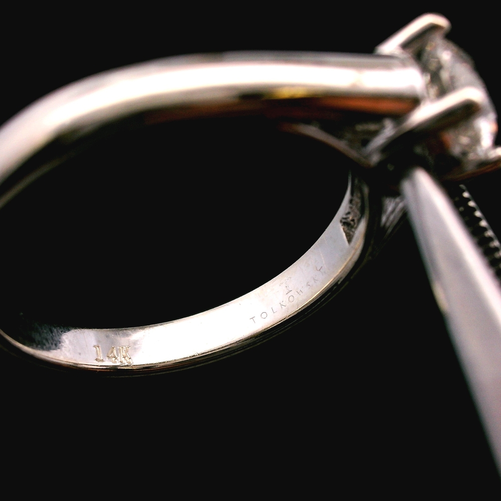 This stunning designer ring is a Tolkowsky Ideal Cut piece crafted in 14K white gold. It features dazzling diamonds with a total weight of 0.73 carats, graded I1 Clarity and I Color. The ring includes the original GSI authenticity card. It is a size 6.5 and has a total weight of 2.60 dwt (approximately 4.0 grams). The item is in good condition. Please review all photos closely to assess cosmetic condition as the item shown is the exact one you will receive. Please note: Price may vary depending on the price of gold and silver.