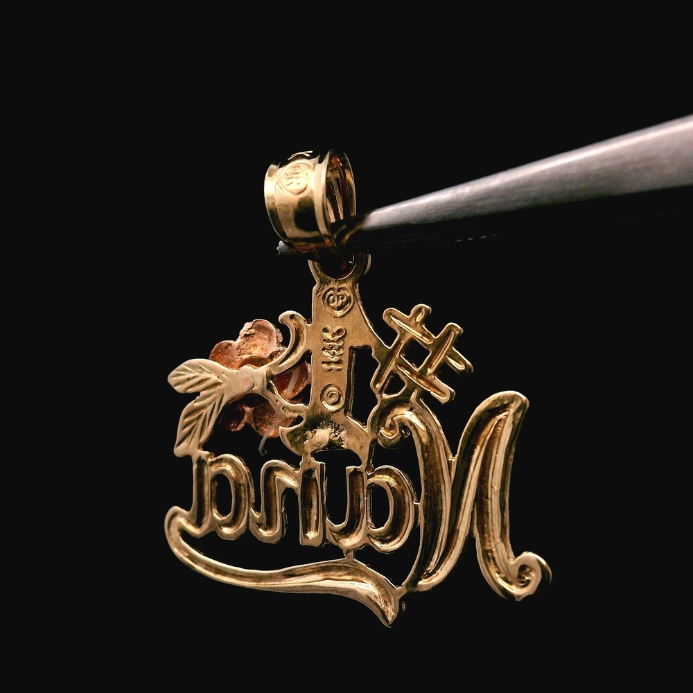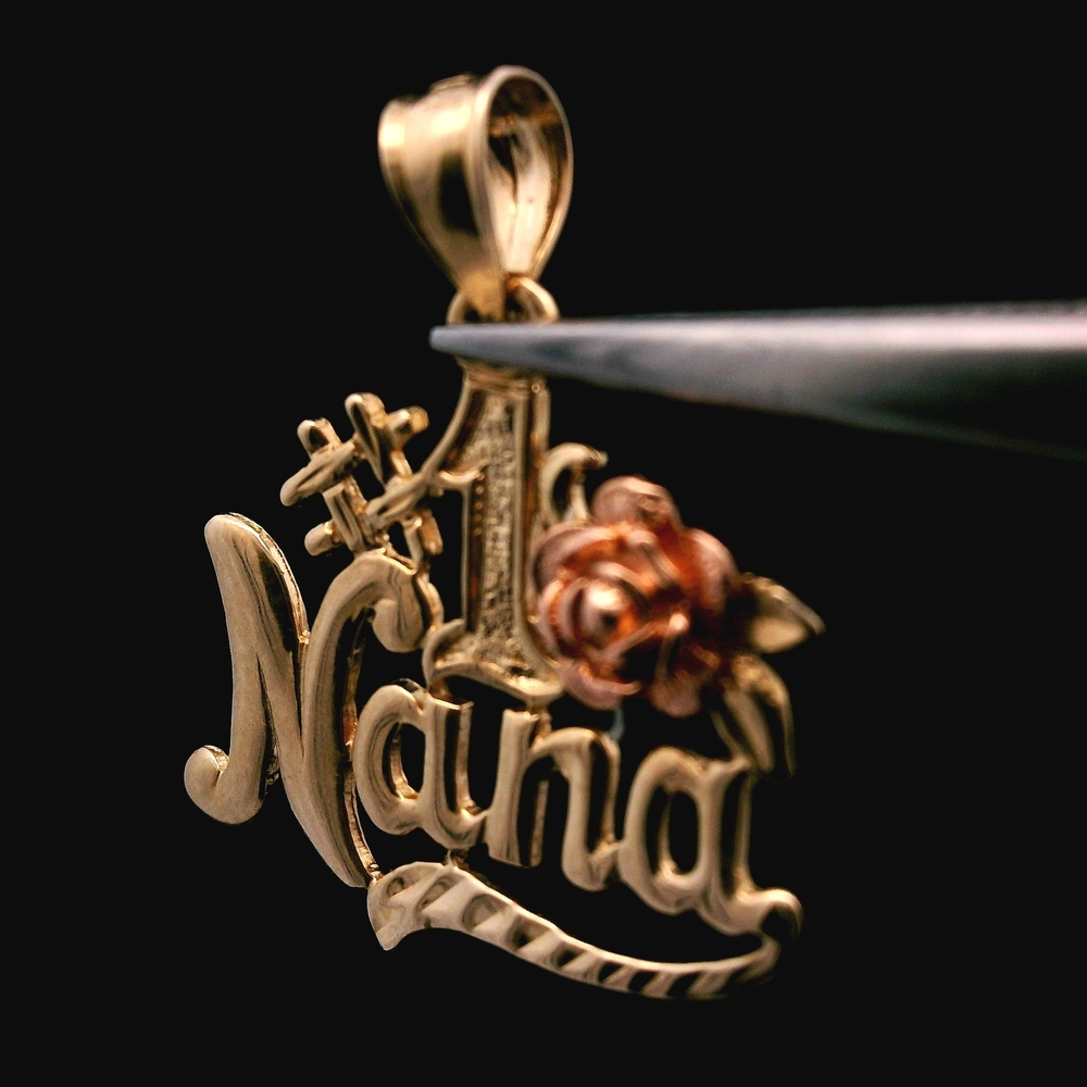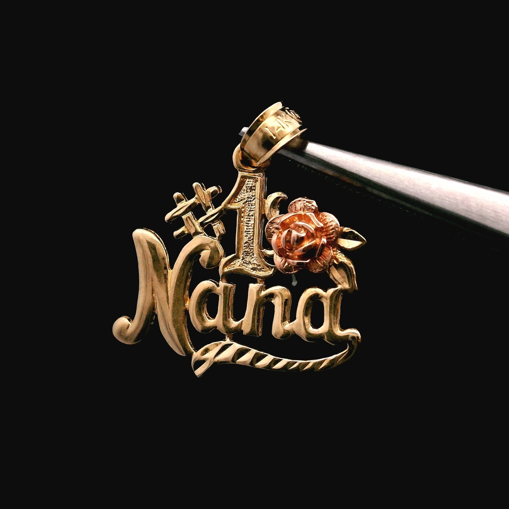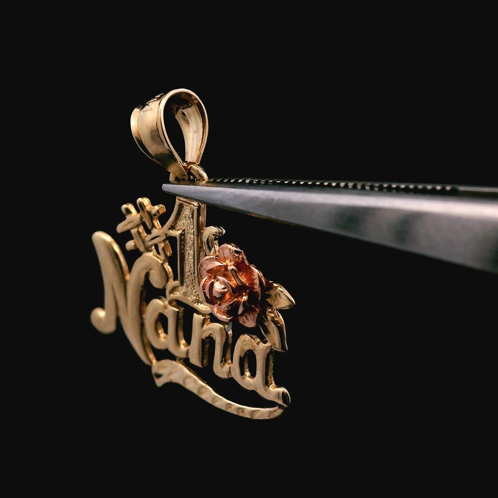This lovely pendant is crafted in 14K yellow gold and features the text "#1 NANA" accented by a beautiful rose flower in contrasting rose gold. It is a heartfelt piece suitable for a necklace chain. The total weight is 0.80 dwt (approximately 1.2 grams). The item is in good condition. Please review all photos closely to assess cosmetic condition as the item shown is the exact one you will receive. Please note: Price may vary depending on the price of gold and silver.