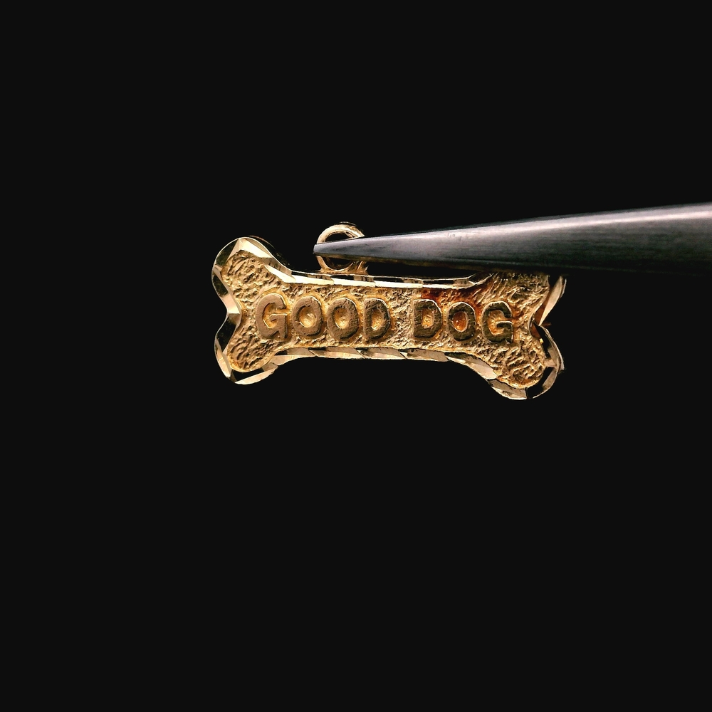 This whimsical pendant is crafted in 14K yellow gold and is shaped like a dog bone with the text "GOOD DOG" inscribed on it. It is a delightful piece for pet owners, weighing 1.2 dwt (approximately 1.9 grams). The item is in good condition. Please review all photos closely to assess cosmetic condition as the item shown is the exact one you will receive. Please note: Price may vary depending on the price of gold and silver. Chain is not included.