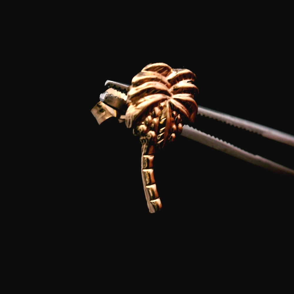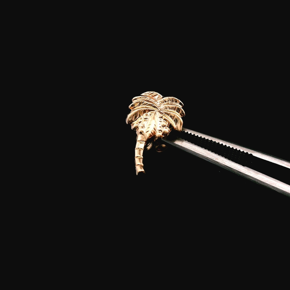 These charming stud earrings are crafted in 14K yellow gold and feature a fun palm tree design, perfect for adding a tropical touch to your style. The total weight is 0.30 dwt (approximately 0.5 grams). The item is in good condition. Please review all photos closely to assess cosmetic condition as the item shown is the exact one you will receive. Please note: Price may vary depending on the price of gold and silver.