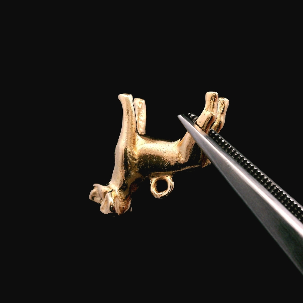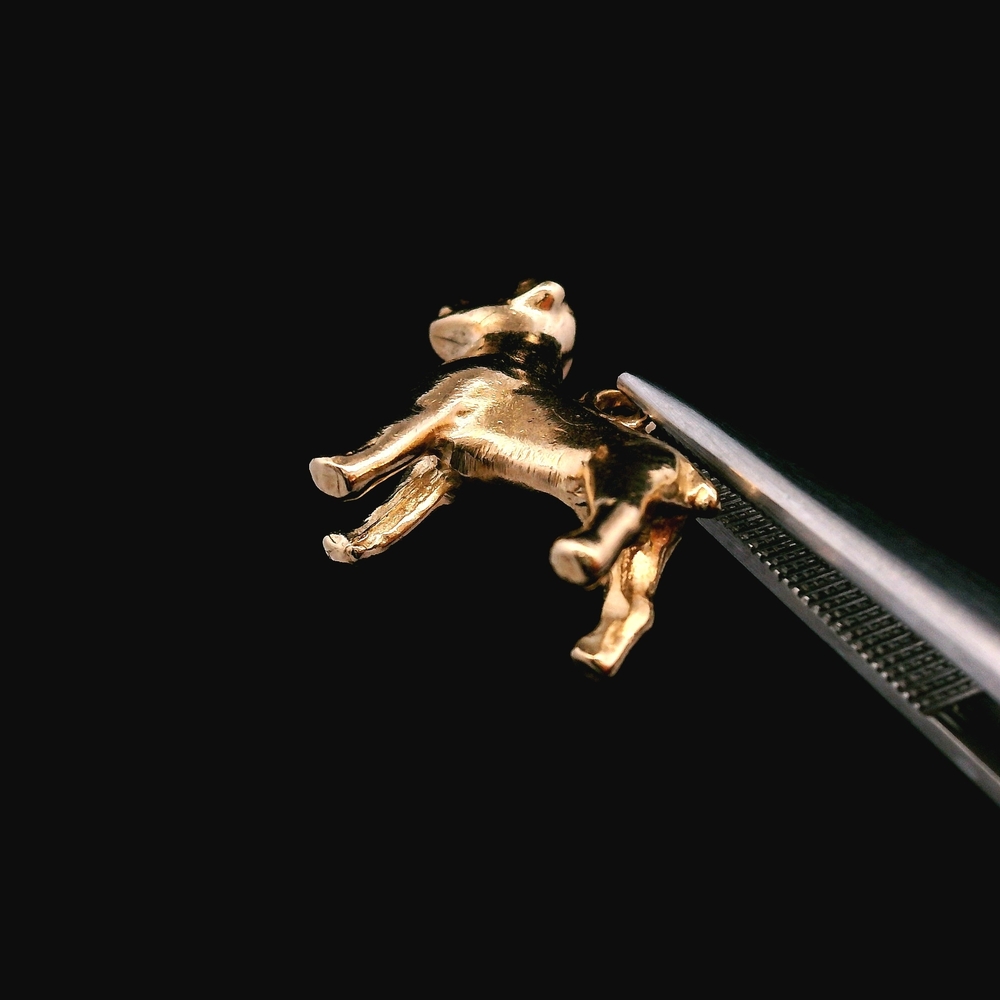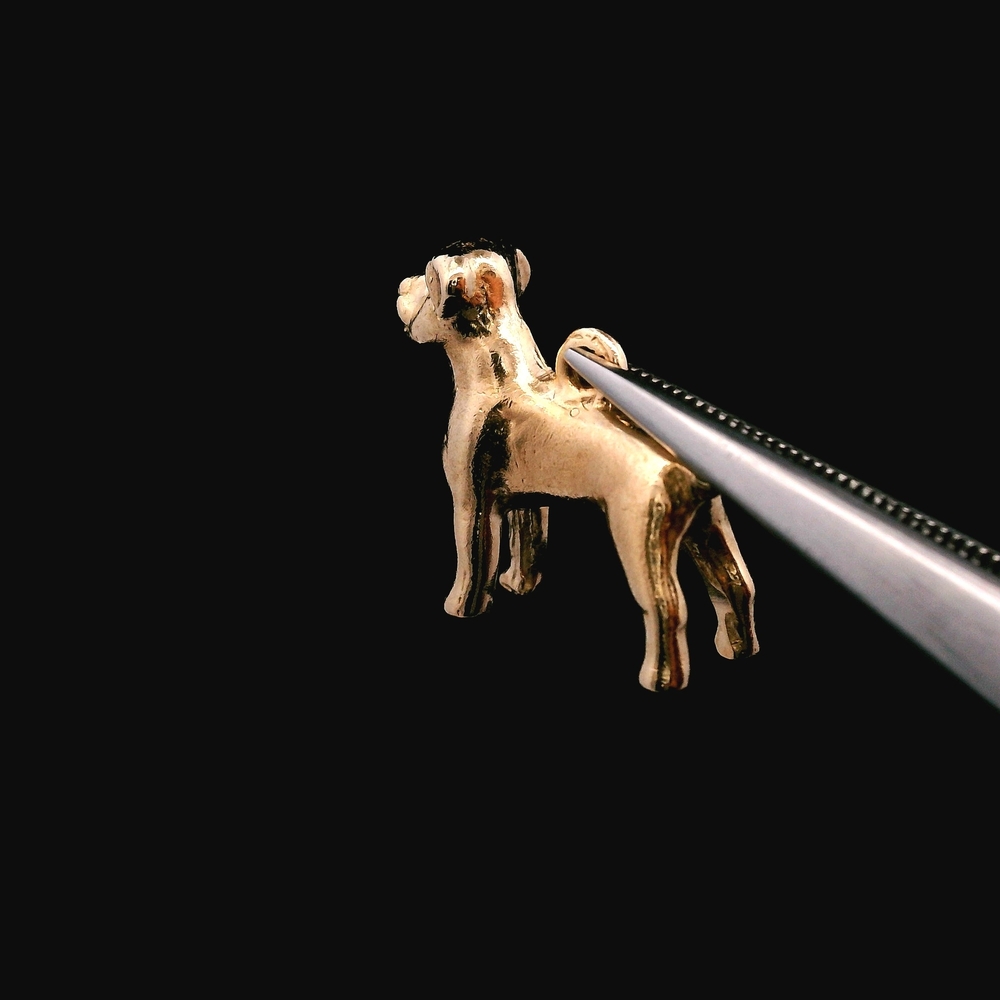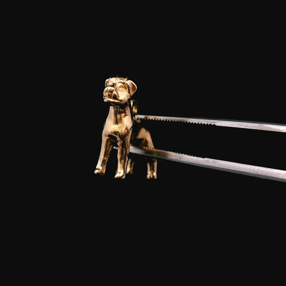This distinctive pendant is crafted in 14K yellow gold and features a detailed depiction of a Rottweiler dog. It is a solid piece with a total weight of 2.4 dwt (approximately 3.7 grams), perfect for dog lovers to wear on a chain or as a charm on a bracelet. The item is in good condition. Please review all photos closely to assess cosmetic condition and design details as the item shown is the exact one you will receive. Please note: Price may vary depending on the price of gold and silver. Chain is not included.