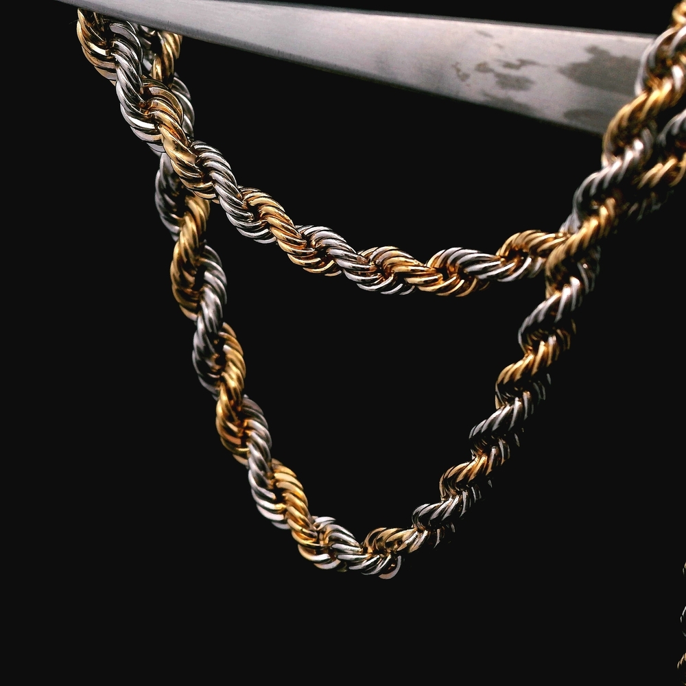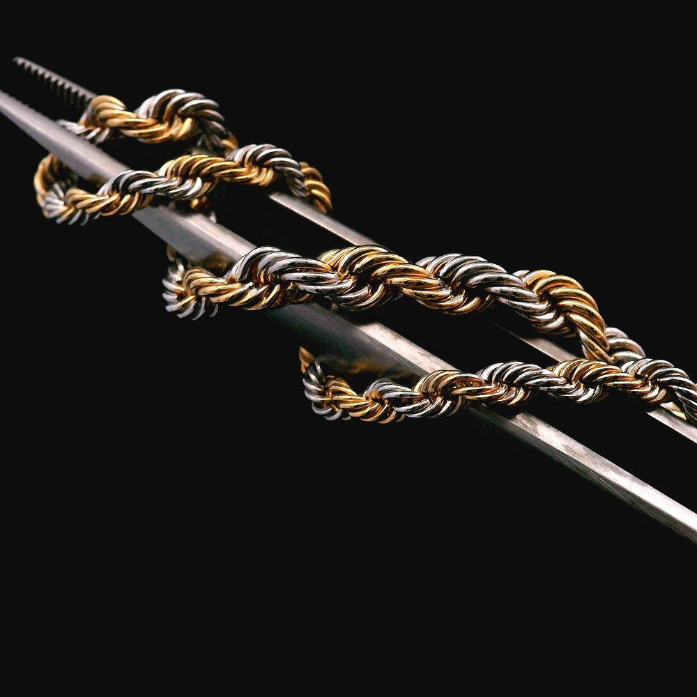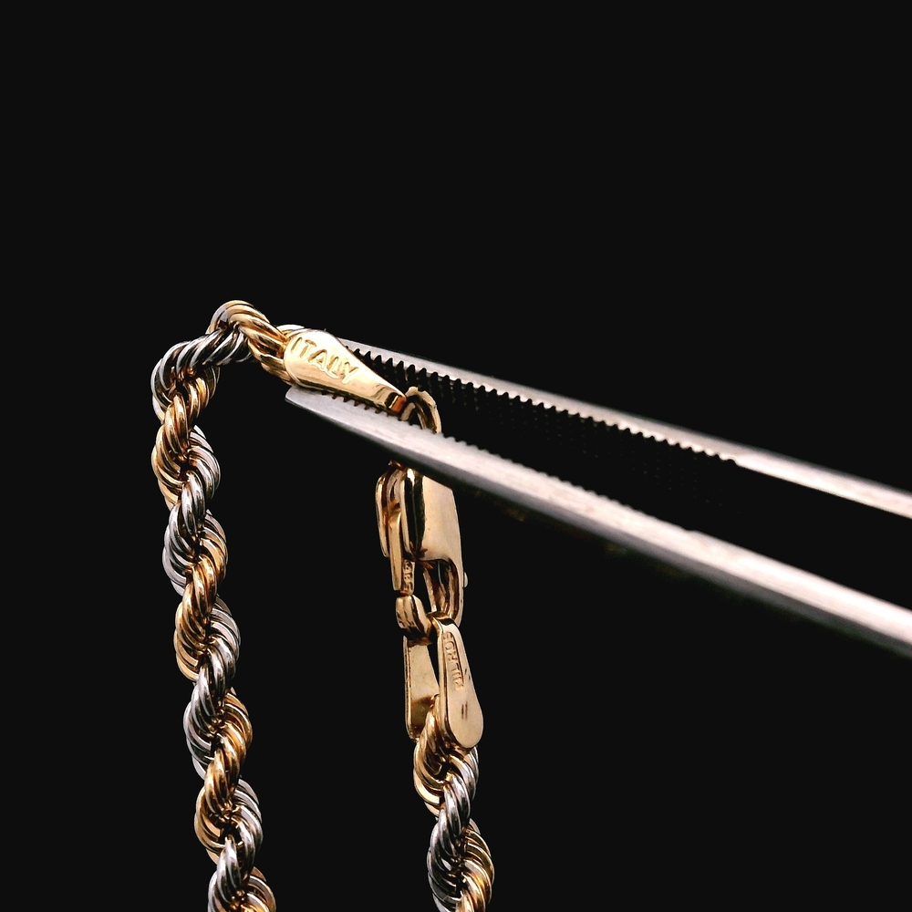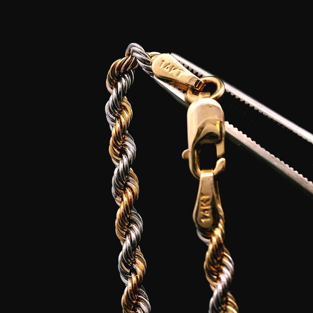 Esta cadena de oro bicolor de 14KT estilo rope presenta hebras entrelazadas de oro amarillo y blanco que aportan brillo y profundidad. Mide 18 pulgadas de largo y pesa 3.5 DWT, ideal para uso diario o para combinar con un dije.