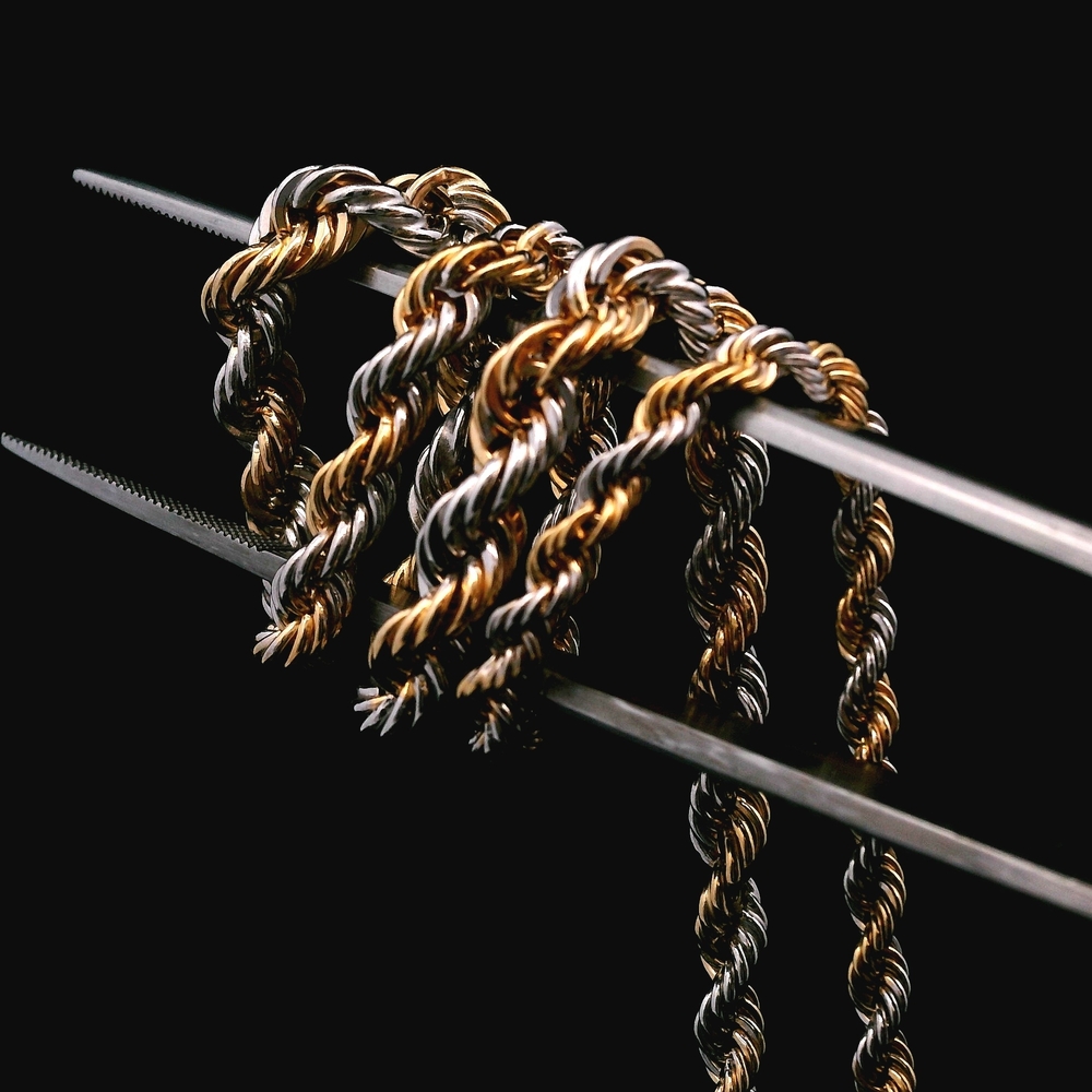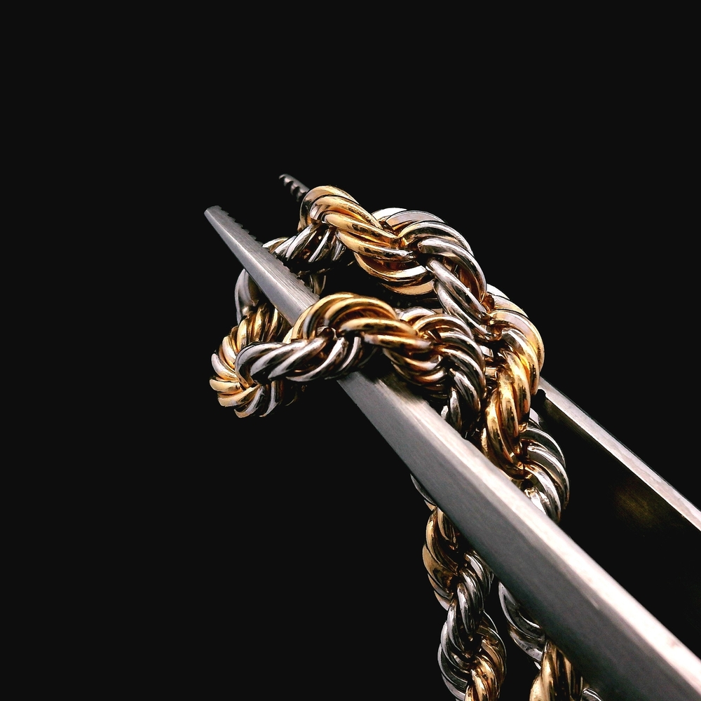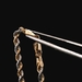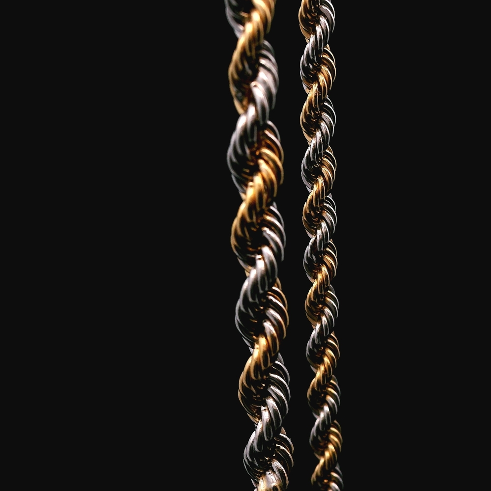 Esta cadena de oro bicolor de 14KT estilo rope presenta hebras entrelazadas de oro amarillo y blanco que aportan brillo y profundidad. Mide 18 pulgadas de largo y pesa 3.5 DWT, ideal para uso diario o para combinar con un dije.
