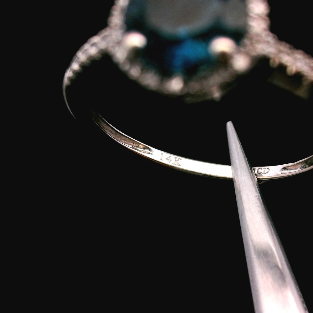 Este anillo de oro blanco de 14KT presenta un topacio azul cielo acentuado con diamantes brillantes, en buena condición con ligeras señales de uso normal. El oro blanco complementa perfectamente el color vívido de la gema y ofrece un estilo elegante y moderno. Con un peso de 1.3dwt, es ligero y cómodo para uso diario o para ocasiones especiales. La talla 7 lo convierte en una pieza versátil para cualquier colección.