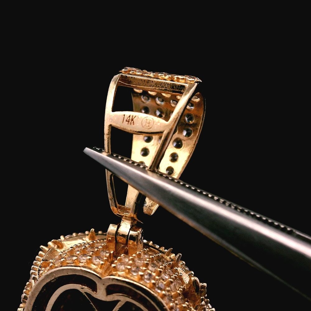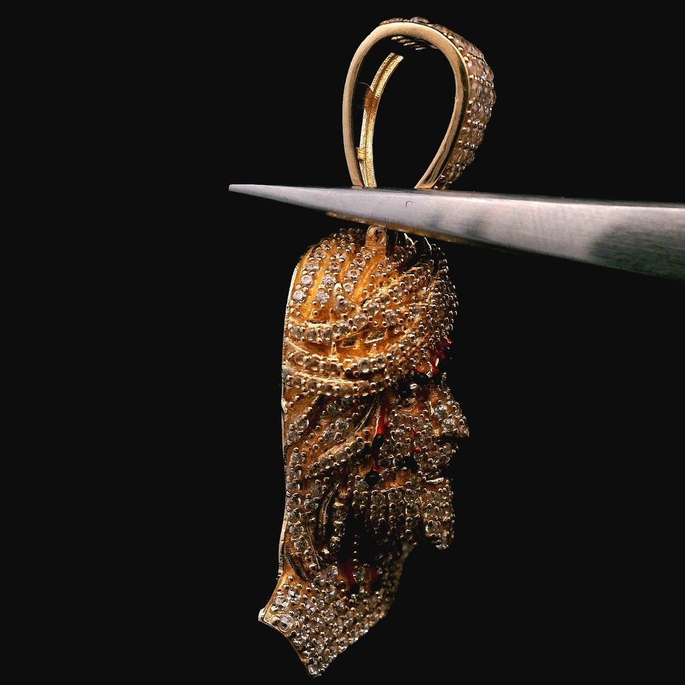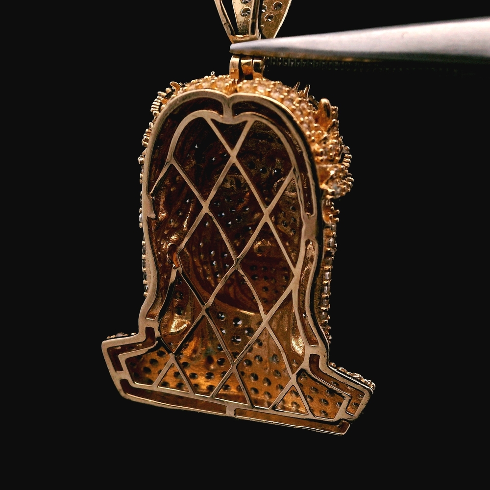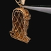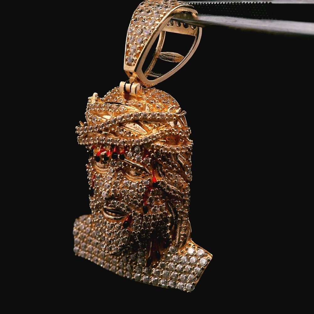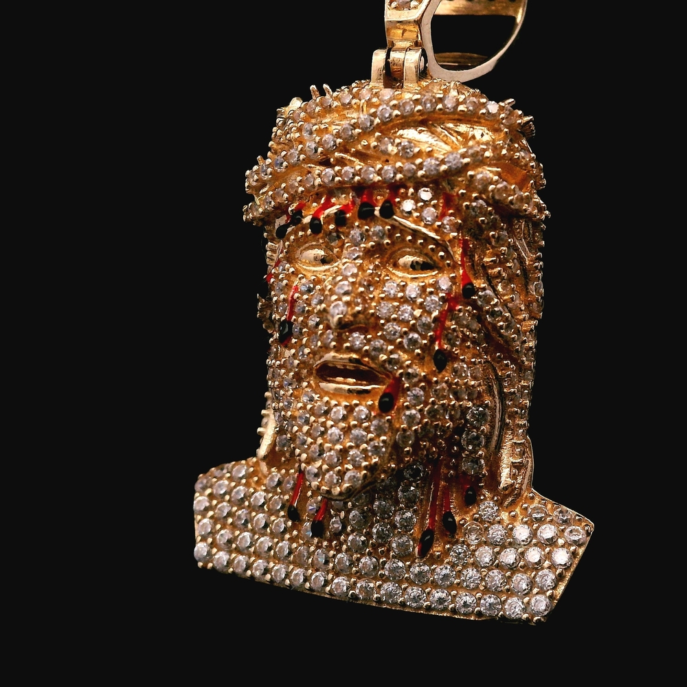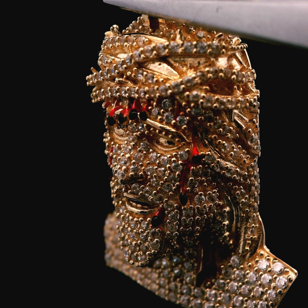This 14KT yellow gold Jesus pendant features detailed craftsmanship with CZ stones throughout and red CZ accents, giving the piece strong visual contrast and character. The design offers bold presence with a polished finish and solid weight.
