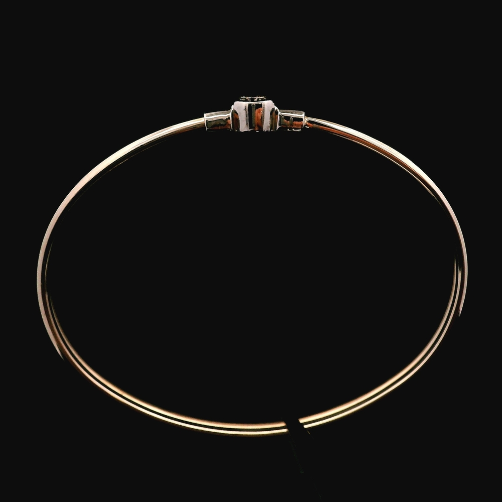 This 14KT yellow gold bangle bracelet features approximately .35 carat total weight in a diamond graded I1 clarity, Z color, adding a warm and unique tone. Its clean, polished design makes it suitable for everyday wear or stacking with other bracelets. Total weight is 5.1 DWT (7.93 grams). Includes a generic jewelry box.