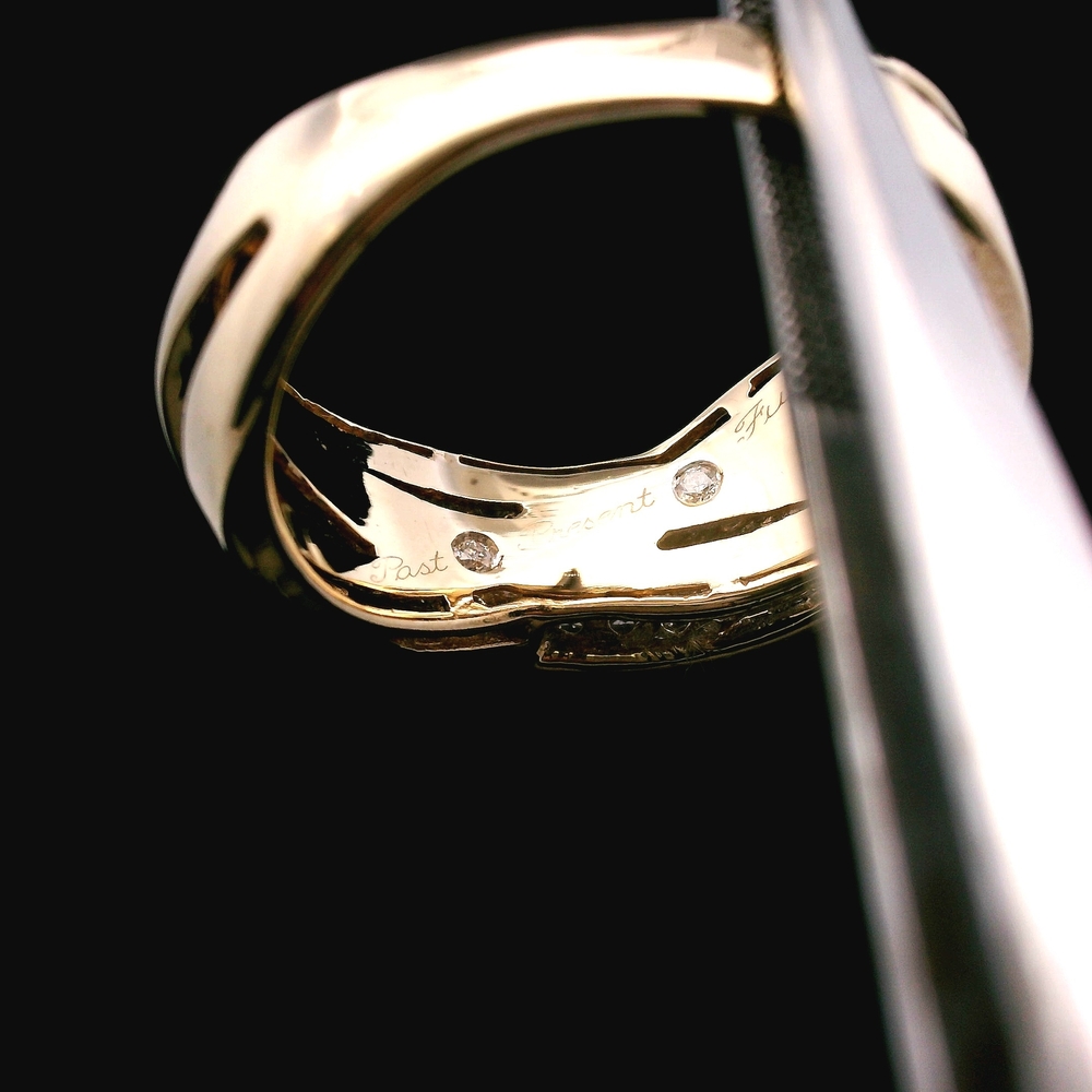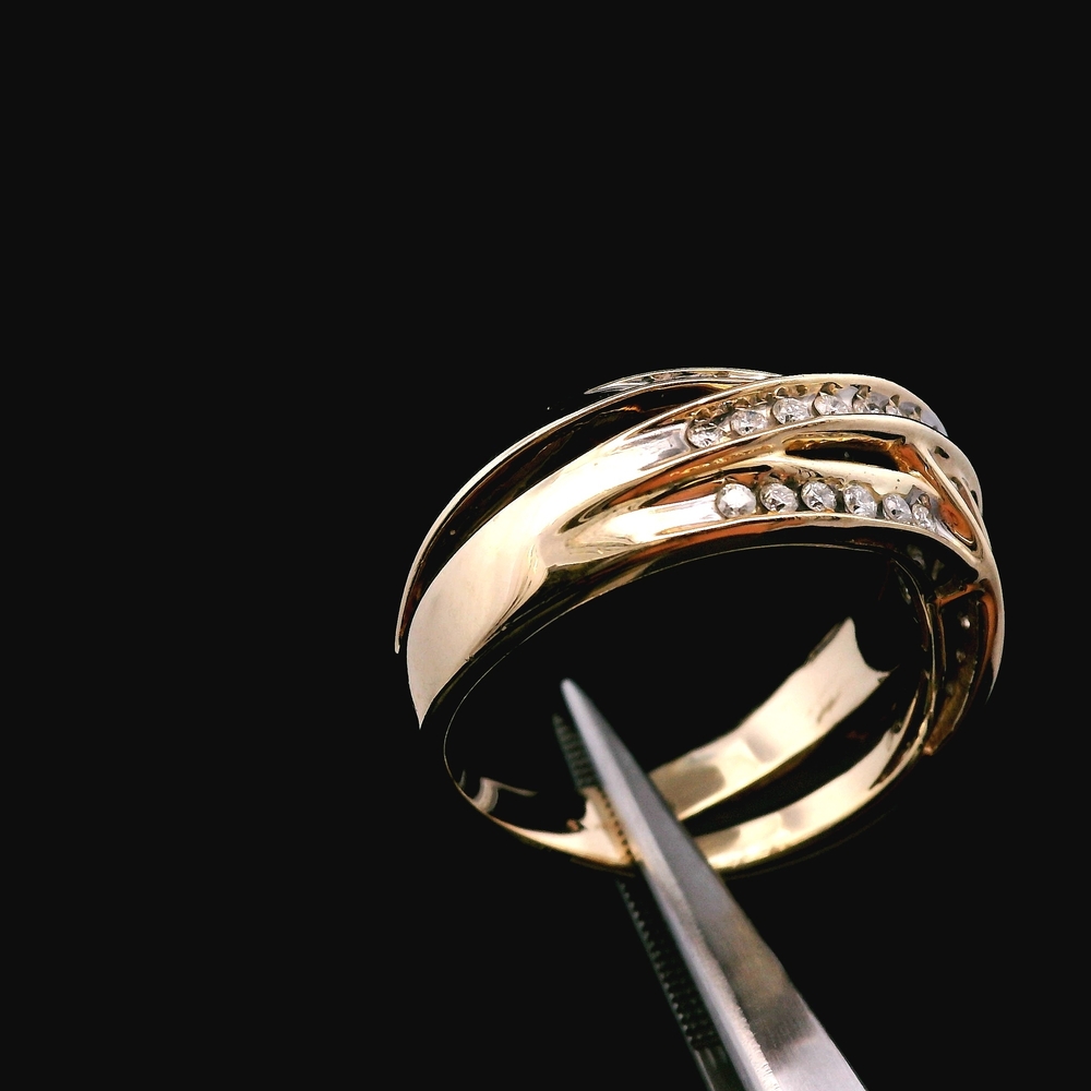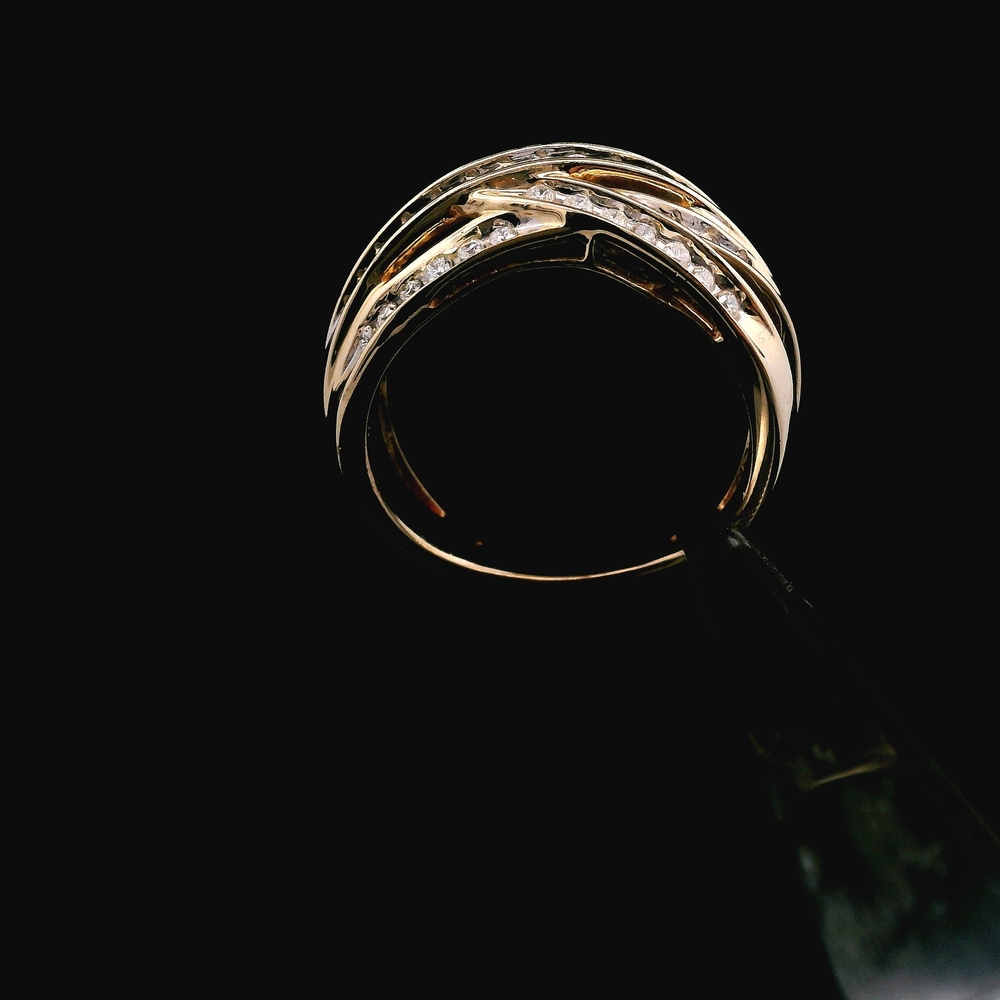 Este anillo de oro amarillo de 14KT presenta aproximadamente ¼ quilate en diamantes, ofreciendo un brillo clásico y adecuado para uso diario. Se siente sólido y cómodo en el dedo.