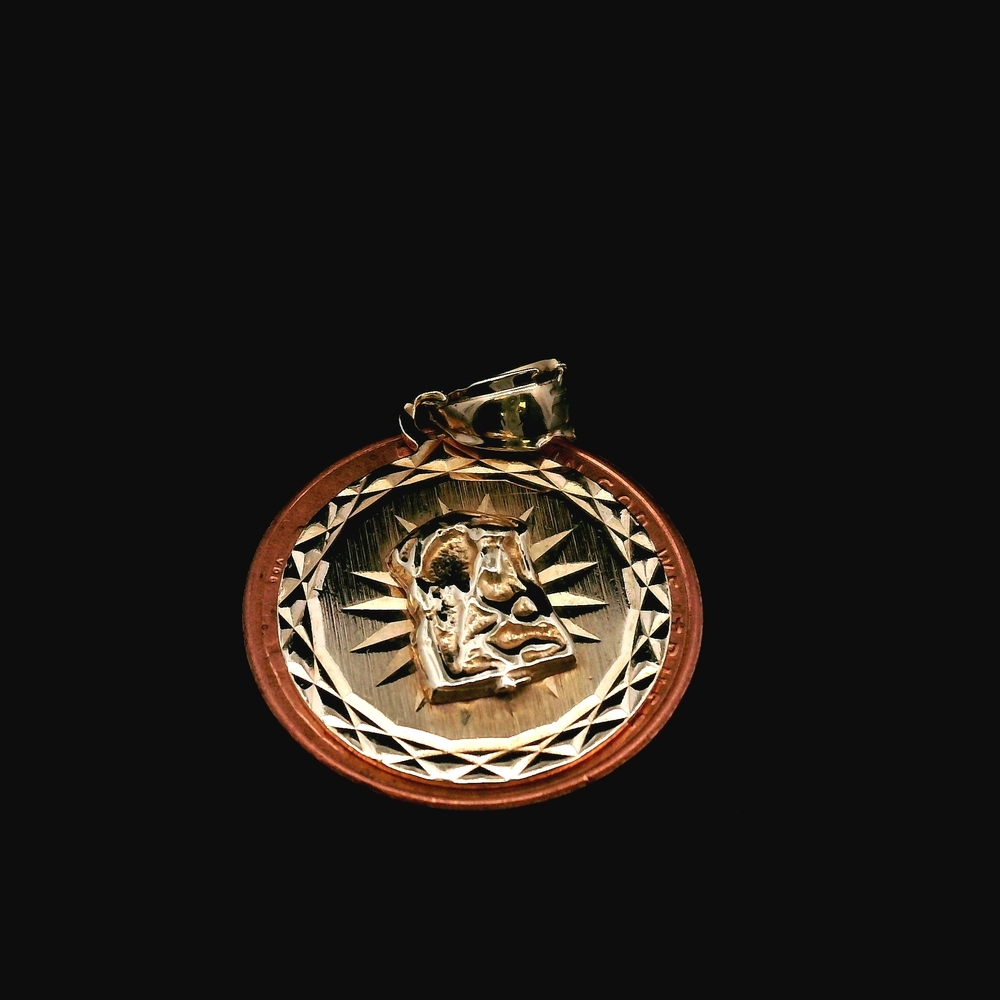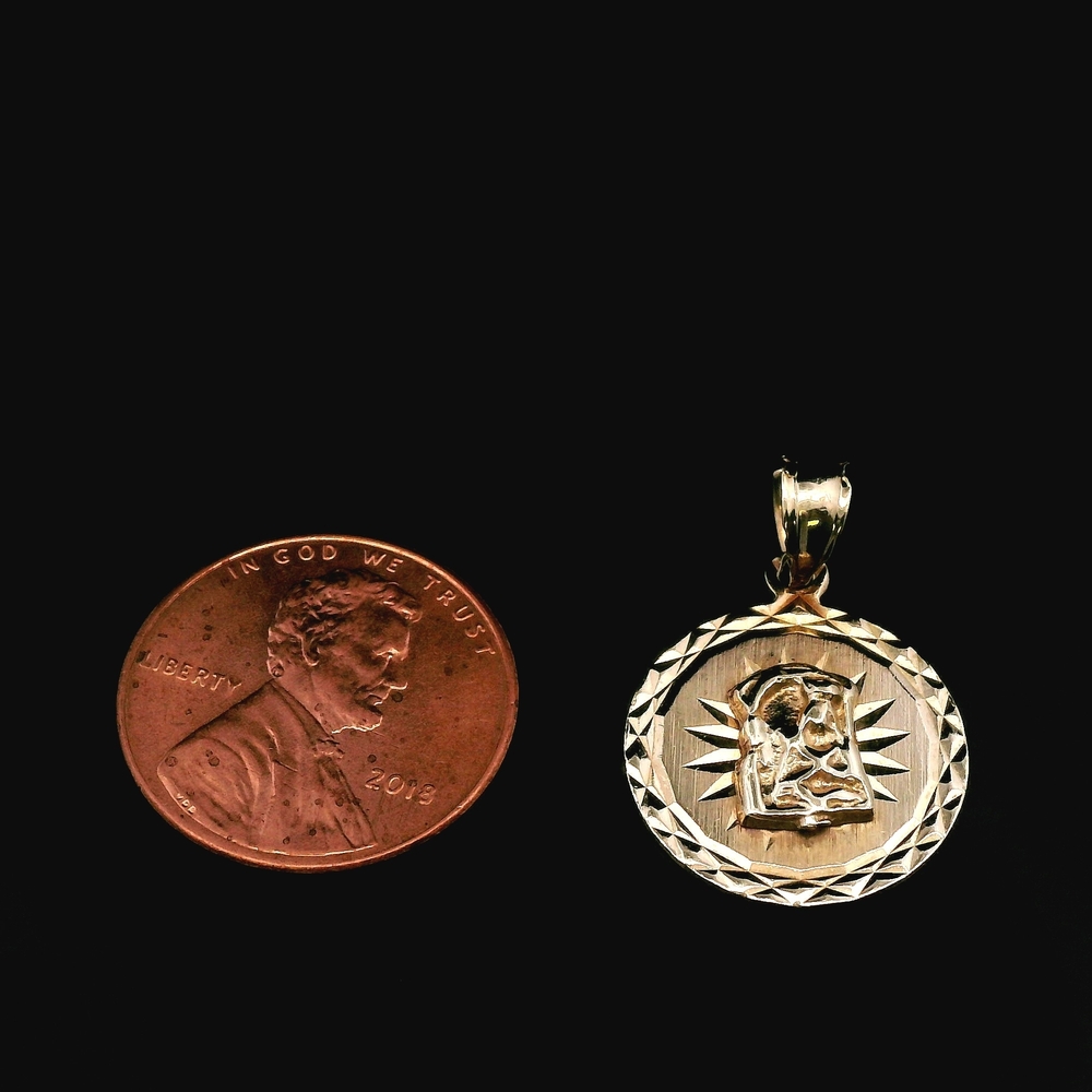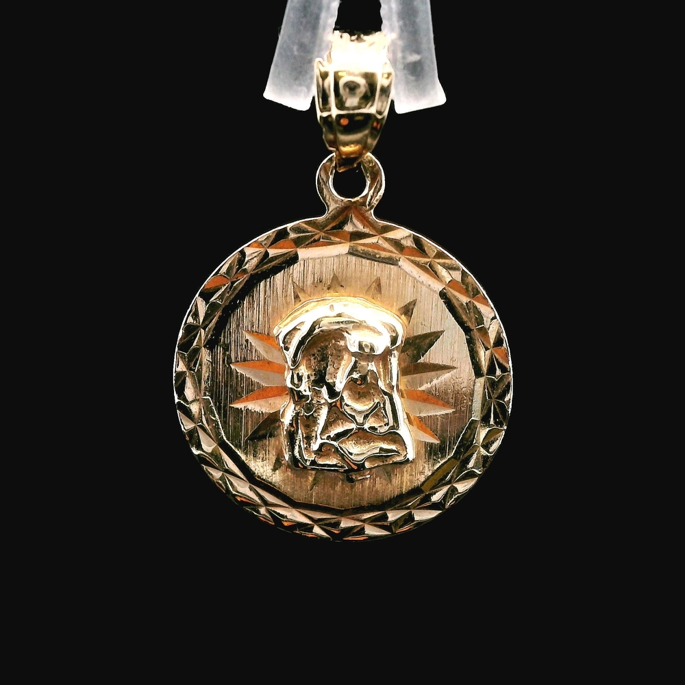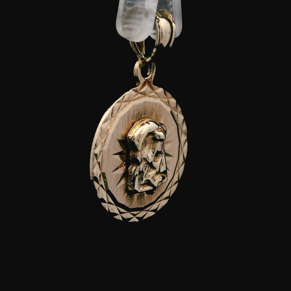 Este colgante de oro amarillo de 14KT presenta una imagen en relieve de Jesús en el centro de un medallón redondo con fondo texturizado. Un patrón de rayos en forma de estrella emerge detrás de la figura, enmarcado por un borde tallado con corte de diamante que añade brillo y detalle. La argolla también está decorada con un sutil diseño que complementa la pieza. Pesa 2.23 gramos. Viene con una caja de joyería genérica.